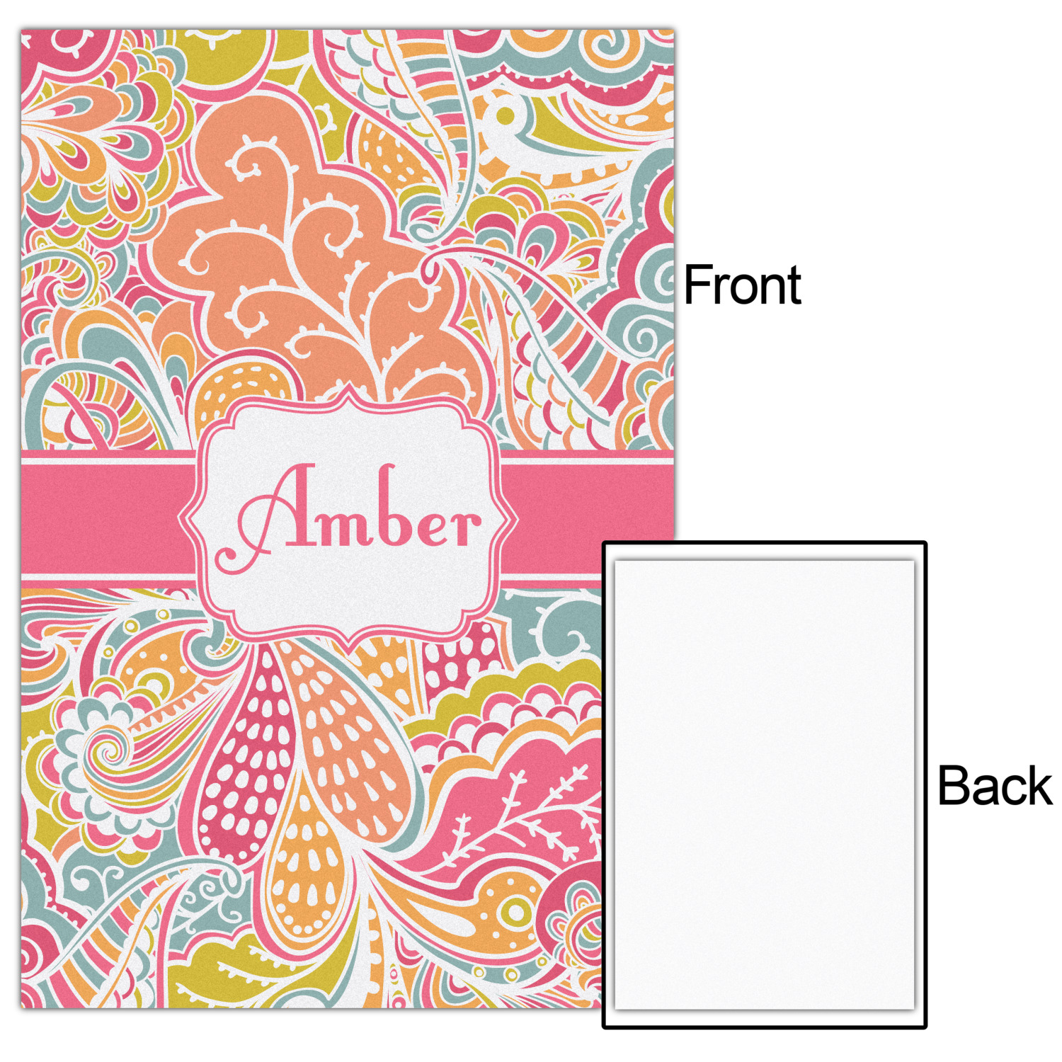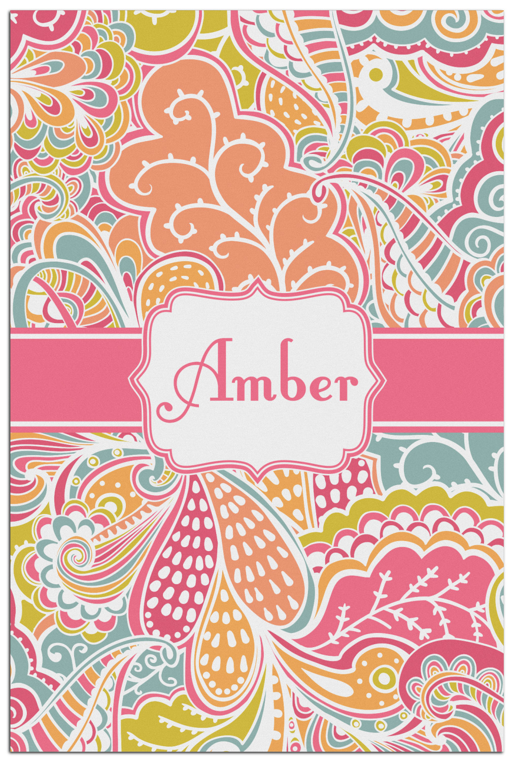 A pink ribbon with white stitching attached to a decorative white label trimmed in pink ties the entire design together. Add personalization of your choice in a coordinating color to make this pattern even more special.