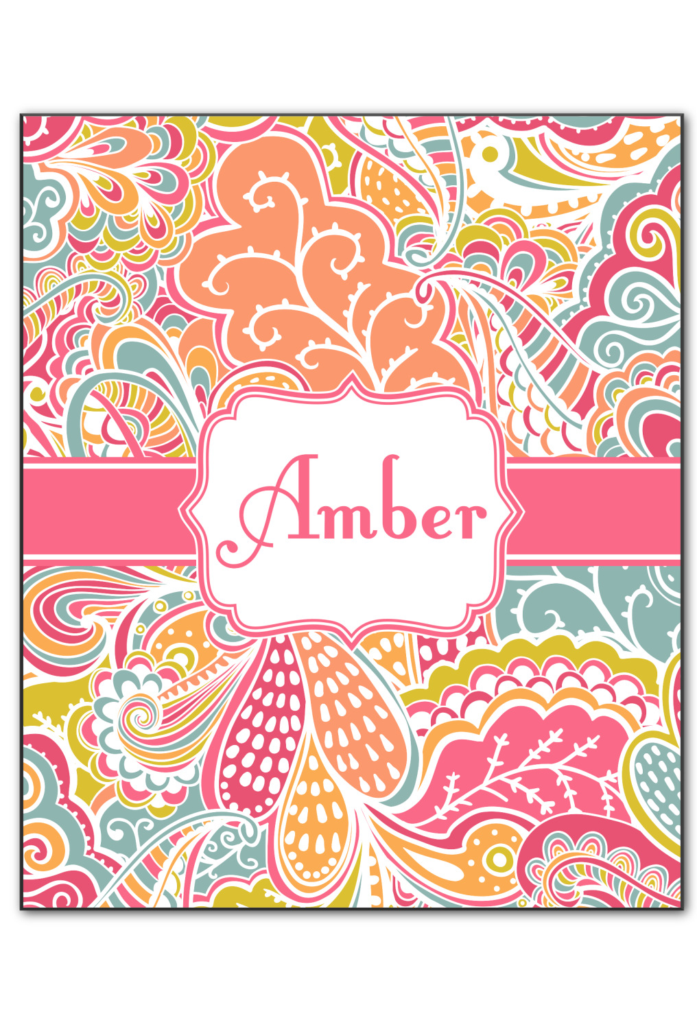 A pink ribbon with white stitching attached to a decorative white label trimmed in pink ties the entire design together. Add personalization of your choice in a coordinating color to make this pattern even more special.