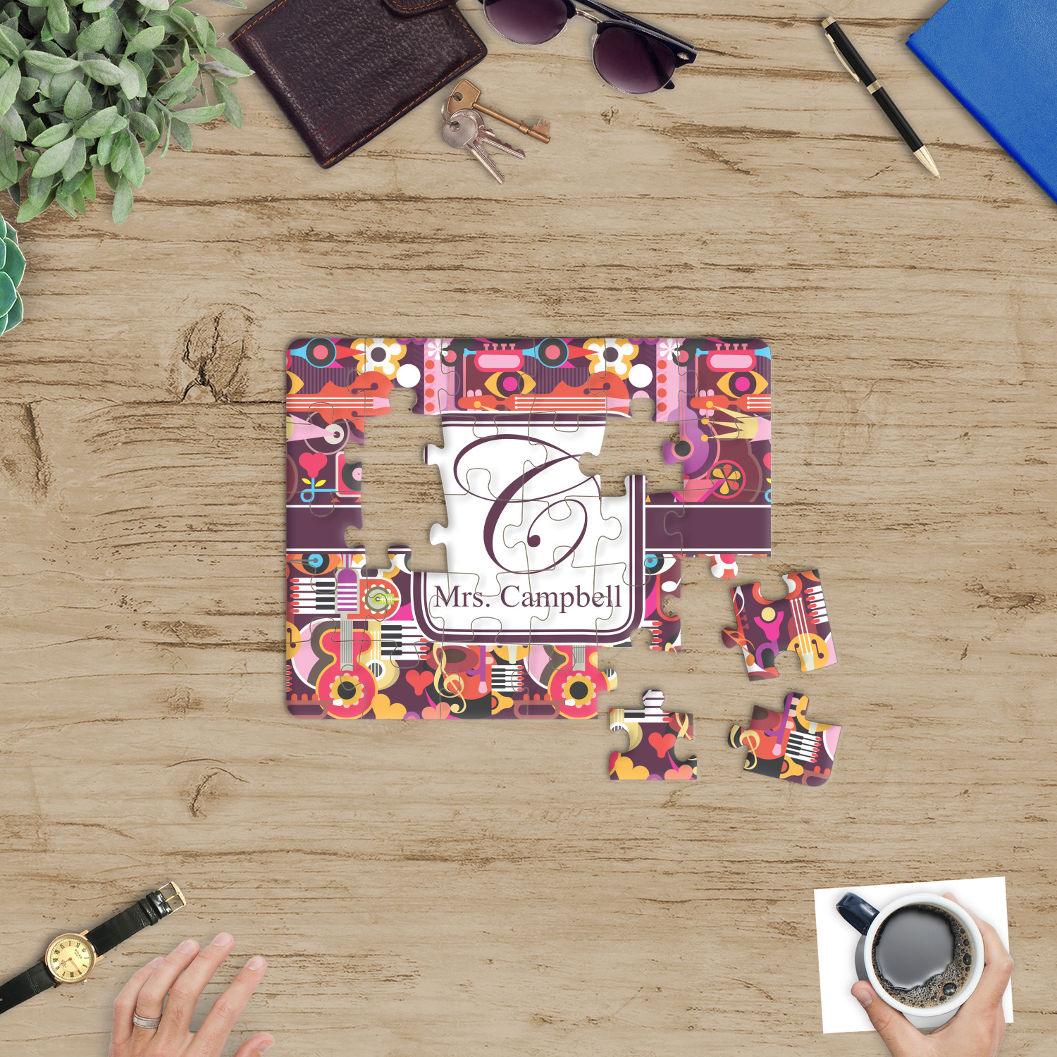 Depending on the look you are trying to achieve, you can add; a thematic pattern or background, with a photo in a frame and text or personalization to your puzzle. Basically if you can imagine it, you can design it!