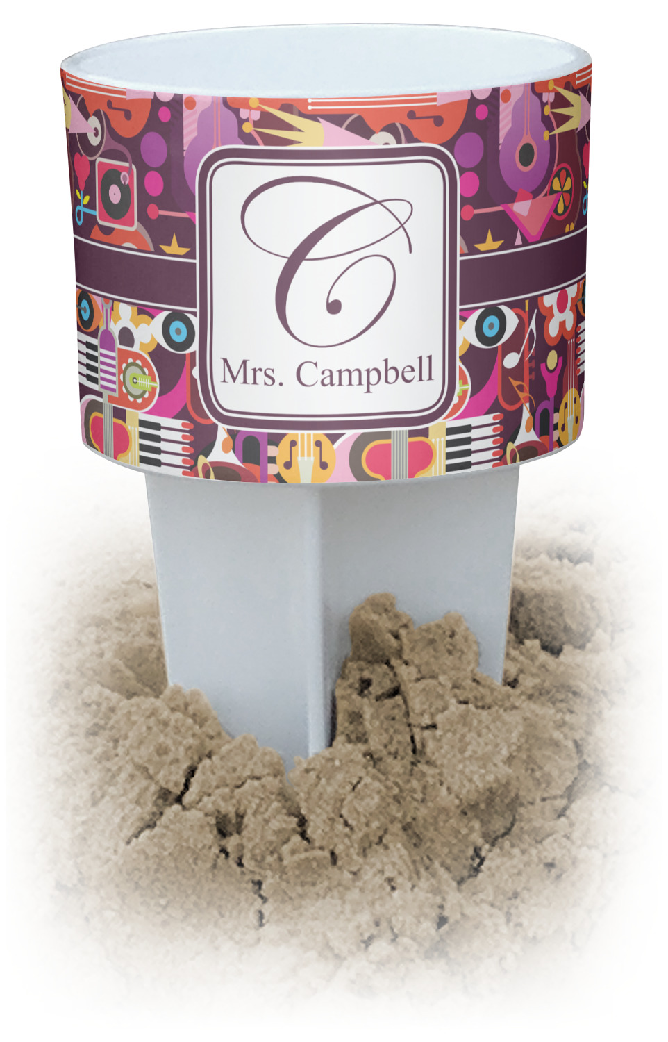 This cup holder has a large stake at its bottom that anchors it to the sand or ground below, while the cup holder rests above the stake. The entire drink holder is made of durable plastic and displays your customization around the cup holder portion. We sell these personalized beach spikers in two different colors: black and white.