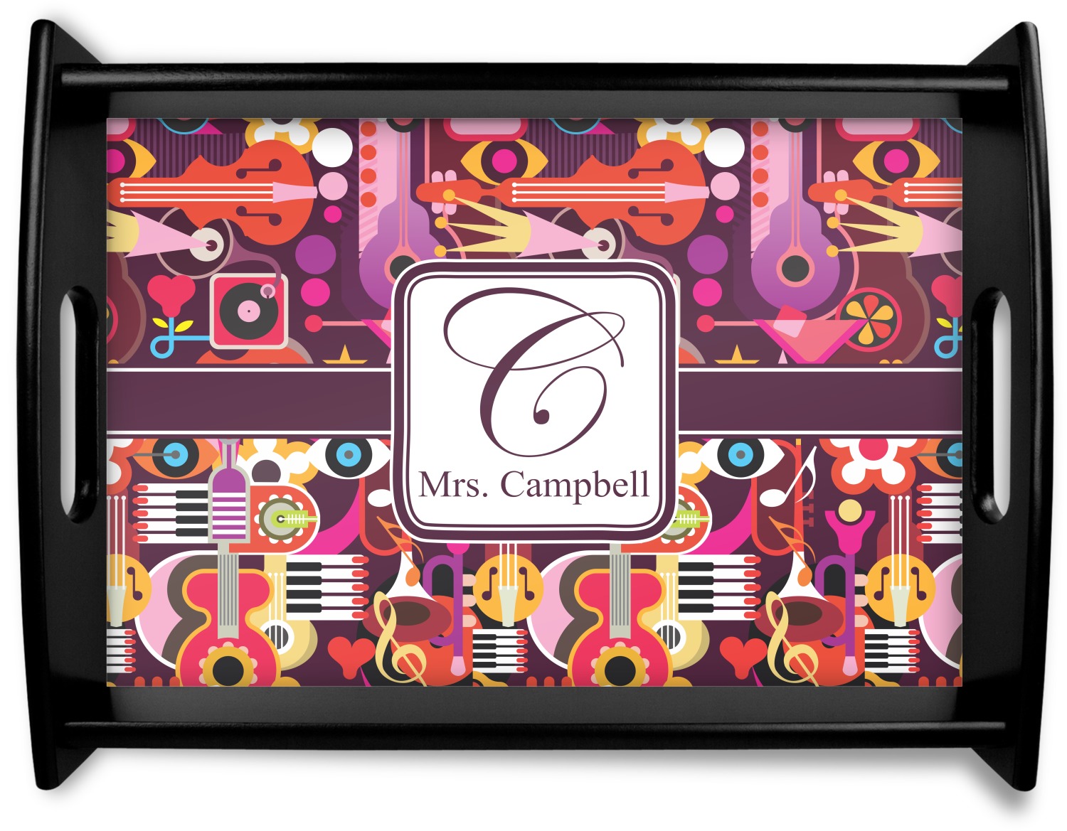 This serving tray with handles features square edges and two rounded sides, creating a very modern look. Each side is fabricated from a beautifully cut, natural wood. The bottom of the interior of the tray displays your customized design in bright, vibrant color. The tray is sold in both a black color and a natural wood look. Each variation of the wood serving tray has two sizes: Small, which is 14" x 10" x 2.25", and Large, which is 19.5" x 13.5" x 2.75".