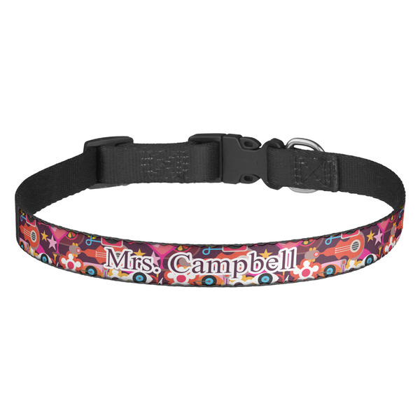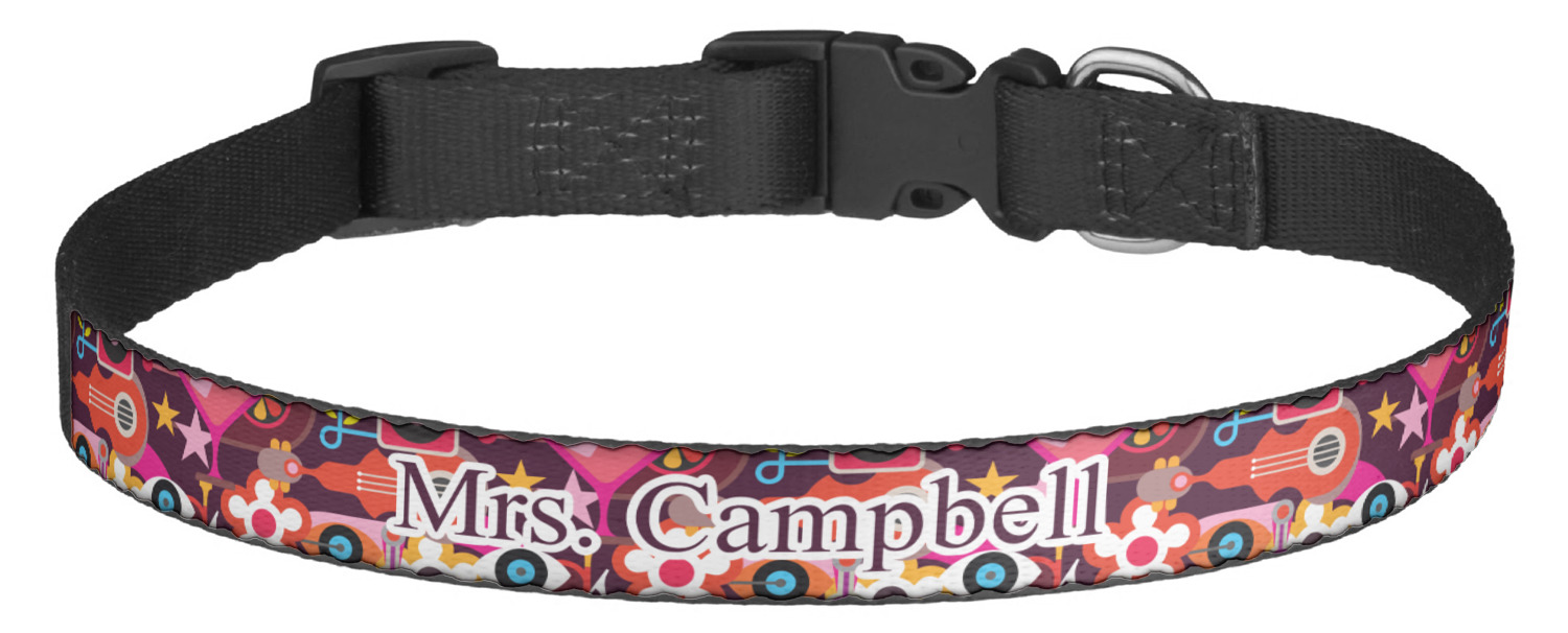 This sturdy collar, made from a durable nylon weave, will outlive your dog's episodes of excited tugging and pulling. Courtesy of its thick plastic buckle and adjuster, this collar is adjustable and accommodating of any dog. Structurally, the collar is a single piece of nylon weave that is sewn together, and features a solid metal loop where you can attach a leash or dog tag. We print and display your dog's name and pattern across the middle of the personalized dog collar.