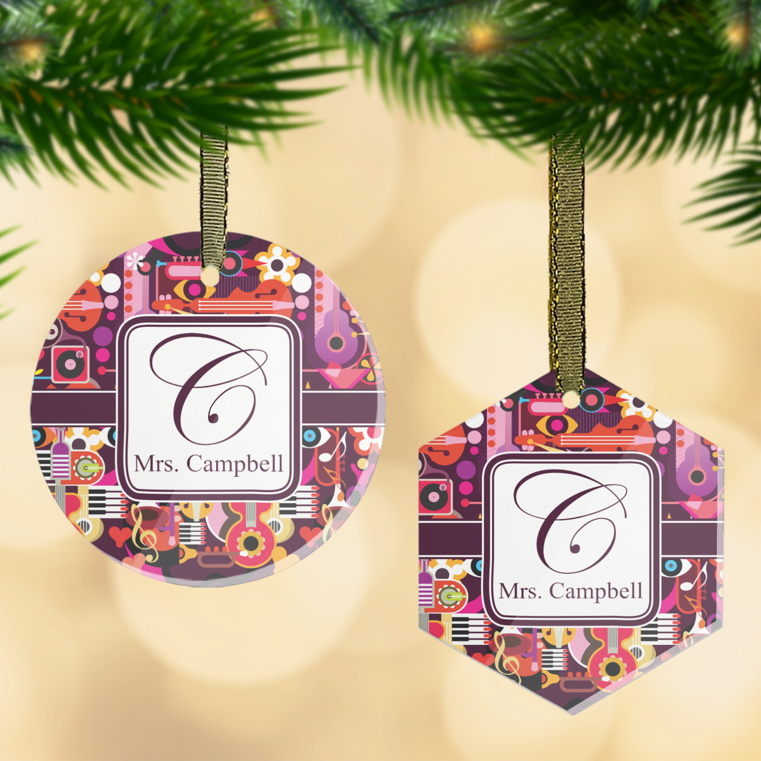 Each of our flat glass ornaments come with a gold string to hang on your Christmas tree with style! We offer two different shapes - flat, round ball or a hexagon. Both glass ornaments have a frosted coating on one side where we print your design while the other side is a clear gloss to give your personalized ornament a sheen finish. Our flat round glass ornament is approximately 3.5" x 3.5" while the flat hexagon ornaments are approximately 3.5" x 3".