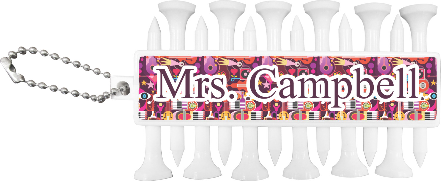 With 12 tees on a lightweight, portable key chain, it almost ensures a great 18 holes. Our tees are made of white plastic and are a little over 2". Design the front and the back of the golf tee holder. Pick from over a hundred designs, colors, and personalization styles! The set even comes with three removable ball markers as well!