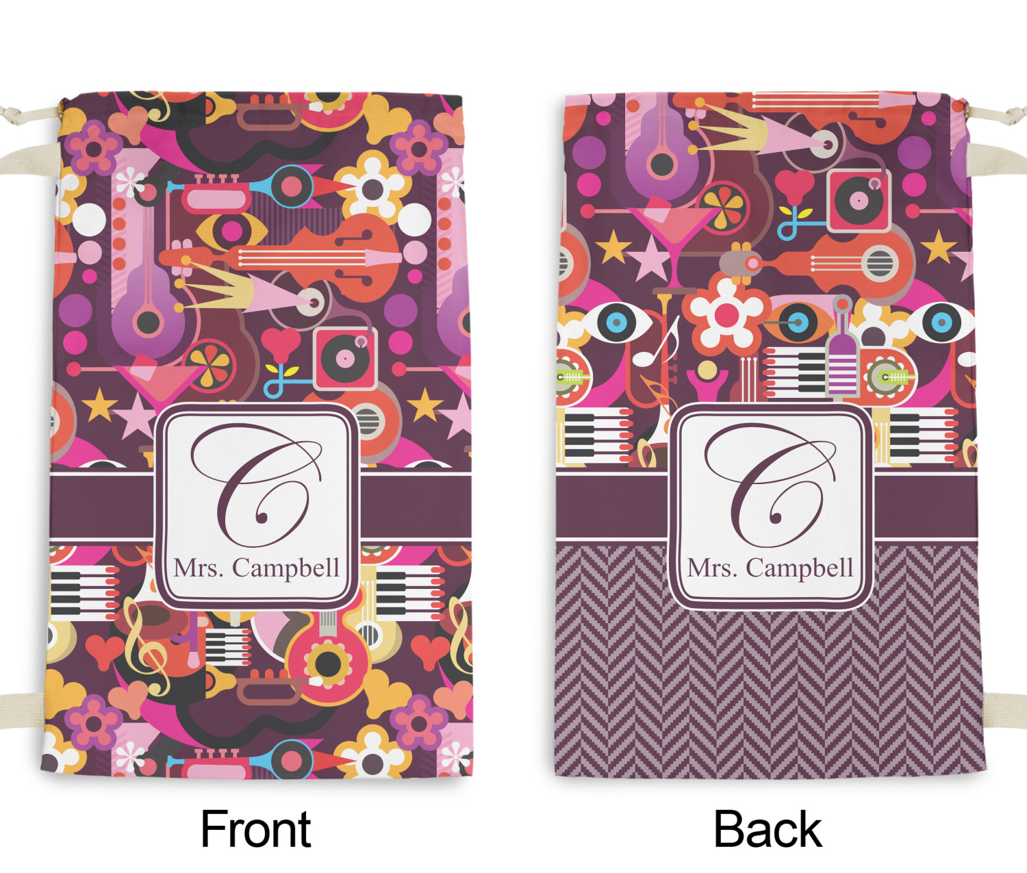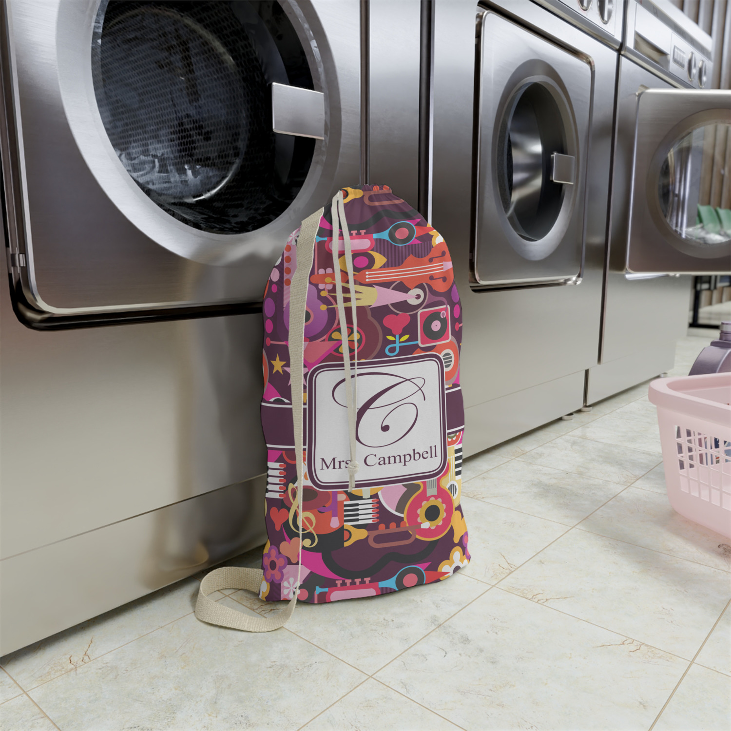 Carry your laundry in style with these customized laundry bags. Available in two sizes, featuring a natural colored woven strap and a cinch cord, these bags hold a lot of clothes or anything else you want to fit in them.