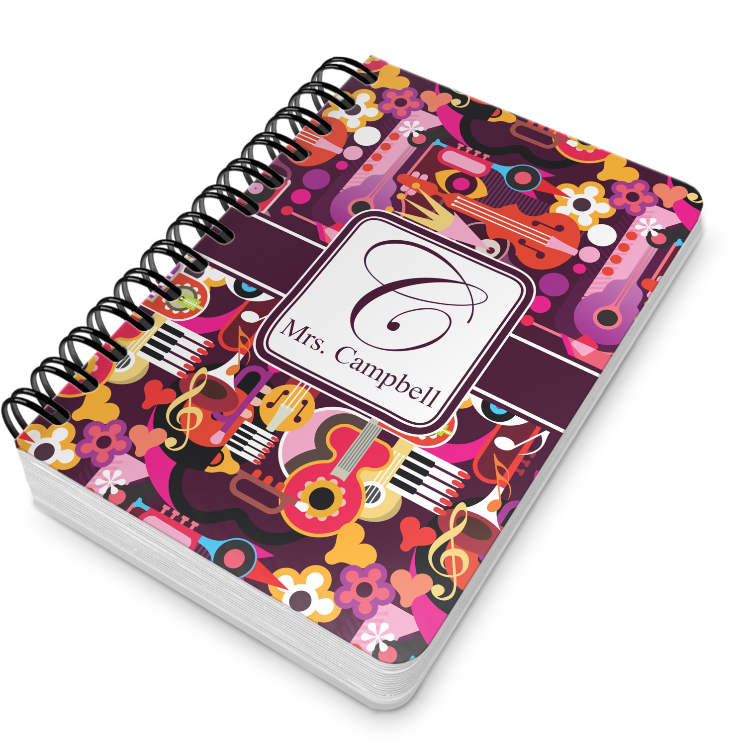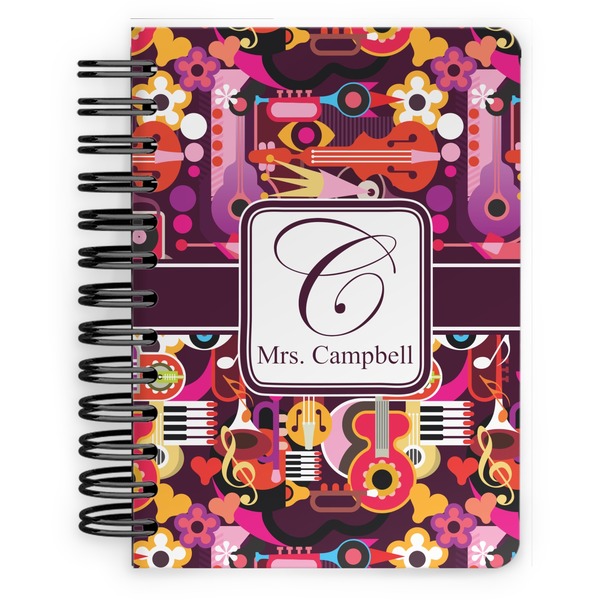 This spiral notebook includes 75 sheets of thick, ruled paper. The front and back of this custom notebook is made of a robust, laminate, plastic covering. We print your personalization on these two panels, underneath a glossy finish, which emphasizes the colors of your design. The two panels and the sheets of paper are held together by a sturdy, black coil. The paper within your bound notebook is perforated for easy, clean tearing.