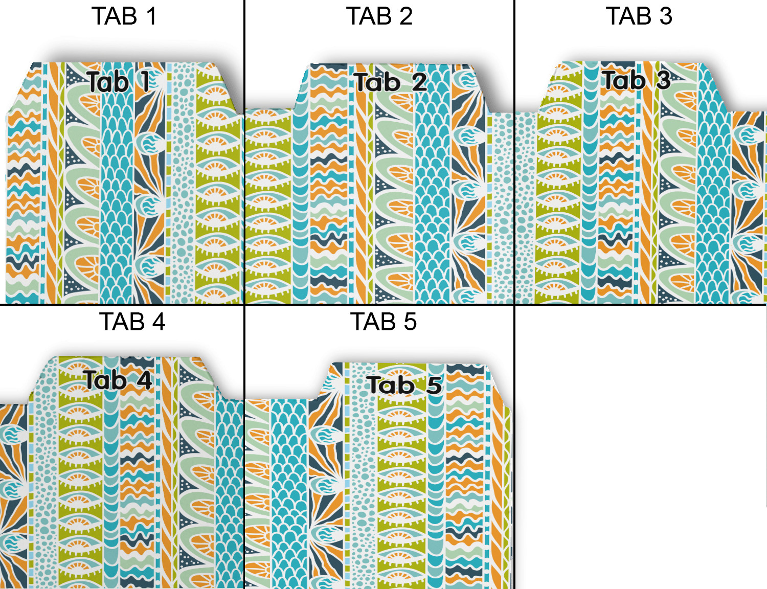 Whether you use binders at school or at work, we have designs to suit all of them. Available in 5 or 6 tab sets, you are sure to find a set to suit your needs. The back of each one is white and can be used to take notes, write vital information on, etc.