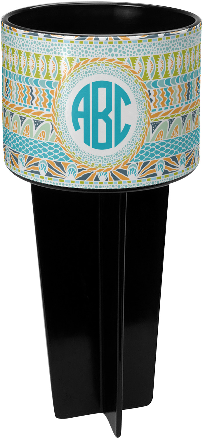 This cup holder has a large stake at its bottom that anchors it to the sand or ground below, while the cup holder rests above the stake. The entire drink holder is made of durable plastic and displays your customization around the cup holder portion. We sell these personalized beach spikers in two different colors: black and white.