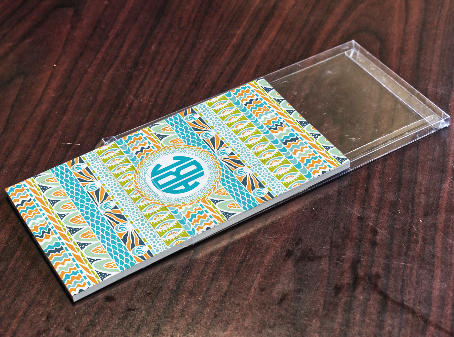In the center of all the striped, rounded, and scaled mayhem is a white label, the eye of the storm, the perfect place for the personalization of your choice.