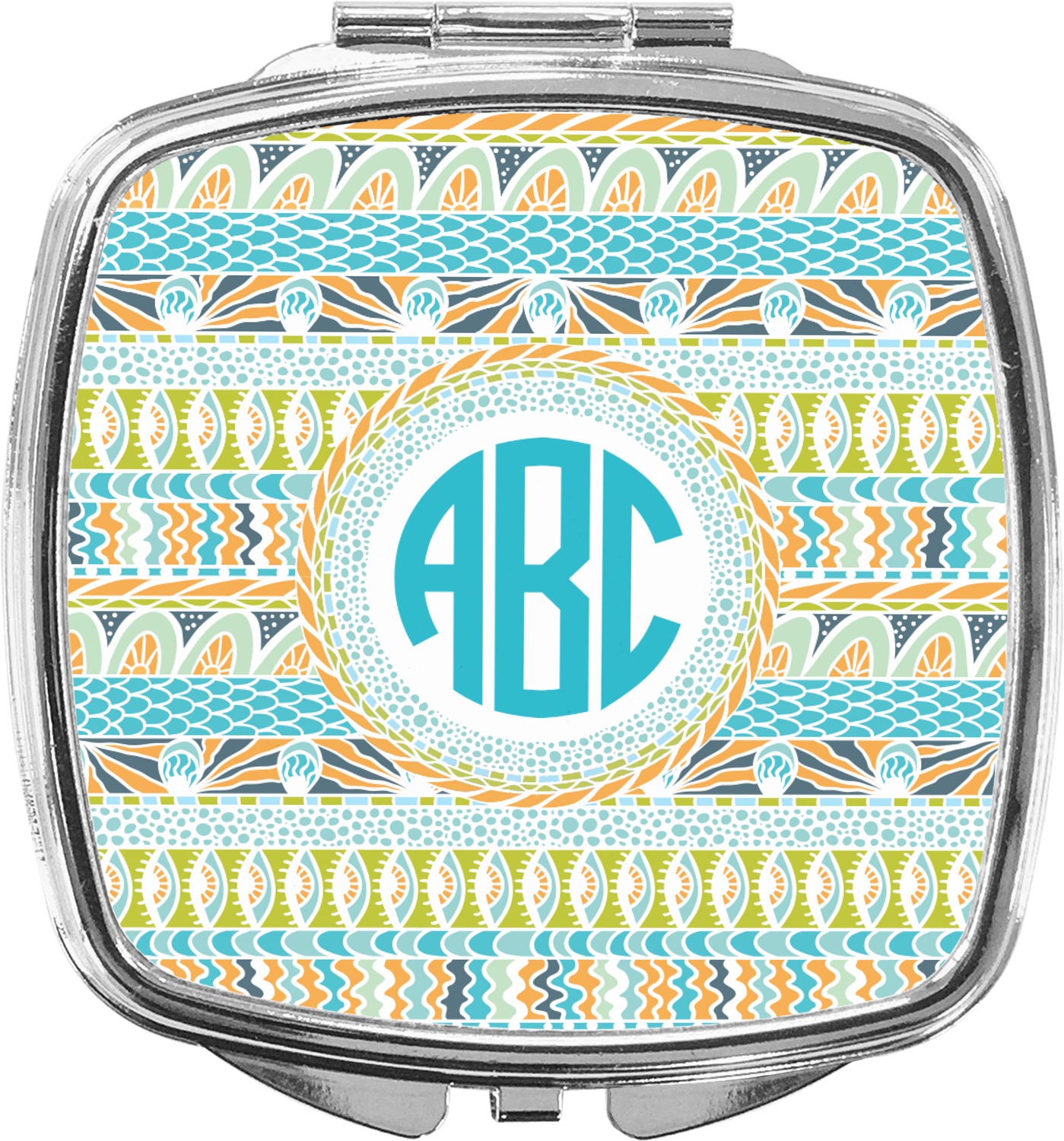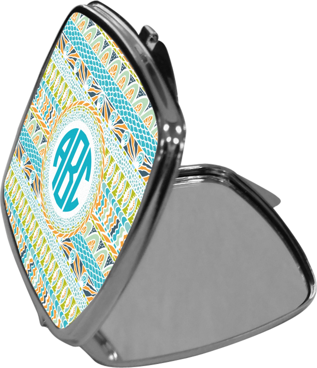 Our compact mirrors are customized with your design on one side. The other side is patterned silver tone metal. Inside, there are two mirrors.