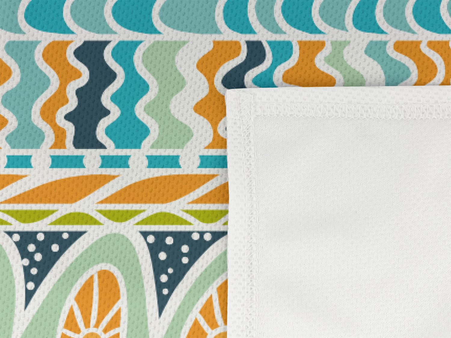 This design takes abstract to the next level by adding fun colors of teal, lime green, and orange to the traditional black and white.