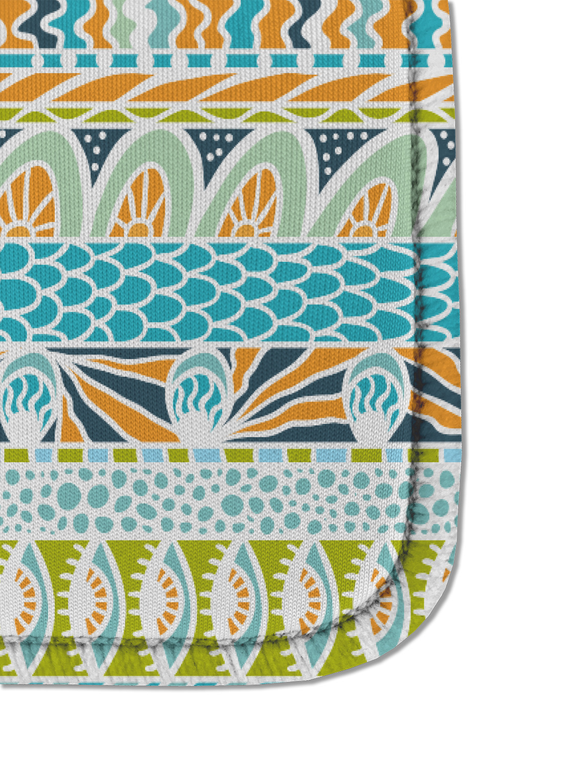 This design takes abstract to the next level by adding fun colors of teal, lime green, and orange to the traditional black and white.