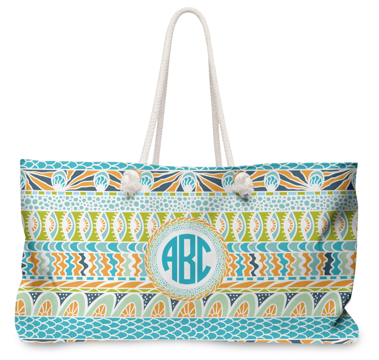 Our oversized weekender tote with rope handles is perfect for your weekend at the beach or on the town. This large tote are 24" W X 13" H, with a 5" gusset and a 27" thick rope handles with a knot that is put through a grommeted brass hole.