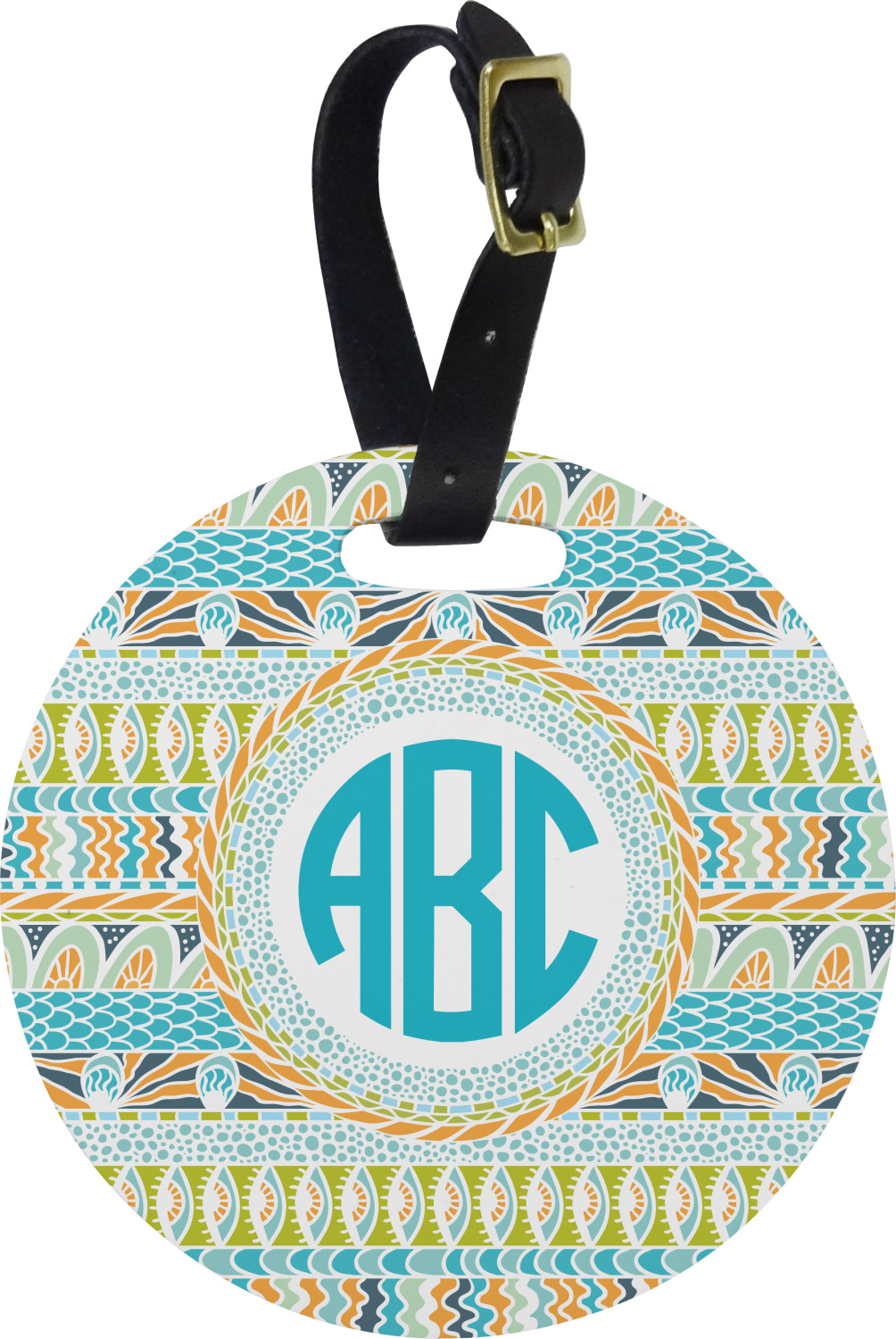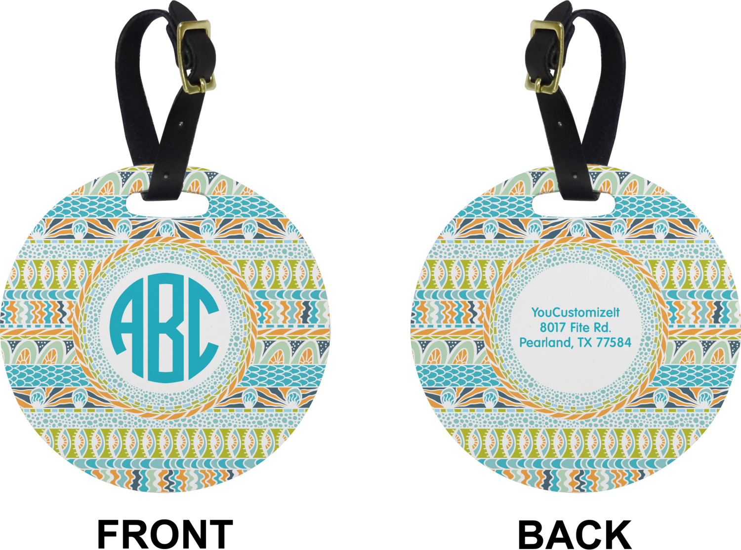 These personalized bag tags are sold in a variety of shapes, so that you may find the product that meets your vision exactly. We sell a round luggage tag, which measures at approximately 4" x 4". Our square luggage tag is about 3.5" x 3.5", while our rectangular version is 2.75" x 4 ".