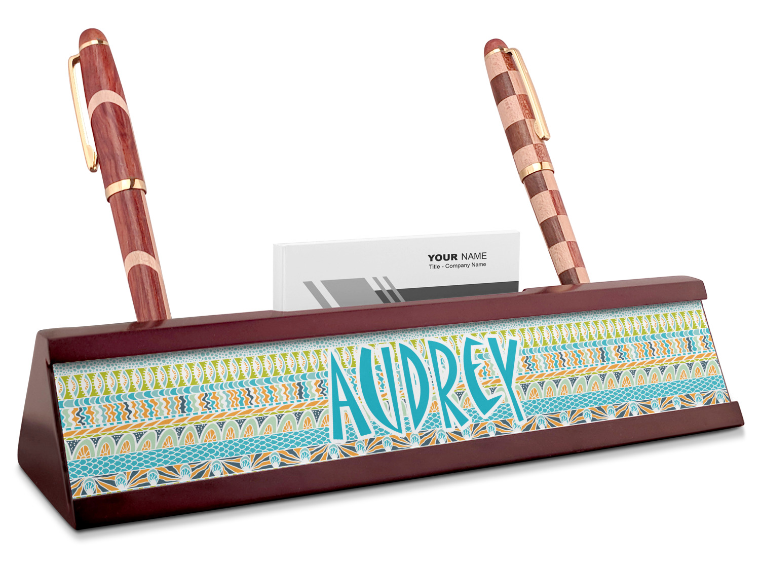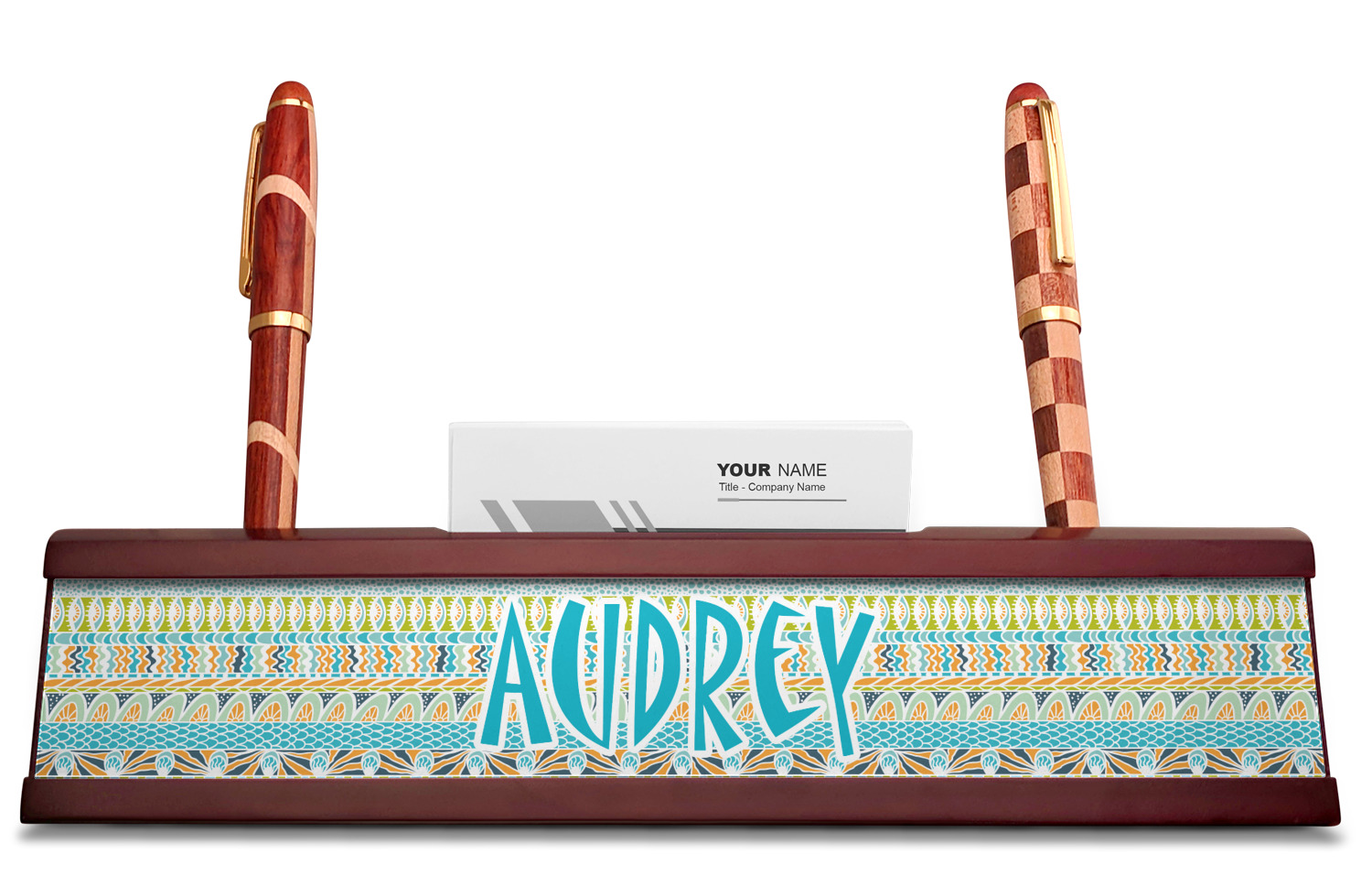Your desk name plates are crafted from a high-quality, dark-cherry mahogany. At approximately 9.5 by 1.875 by 2.5 inches, this name plaque will fit perfectly, front and center, on your desk. Your customization spans across the entire face of the nameplate. Behind the nameplate lies a skinny slot that can fit approximately 15, traditionally-sized, business cards. You can also store your writing utensils on either side of this custom desk name plate.
