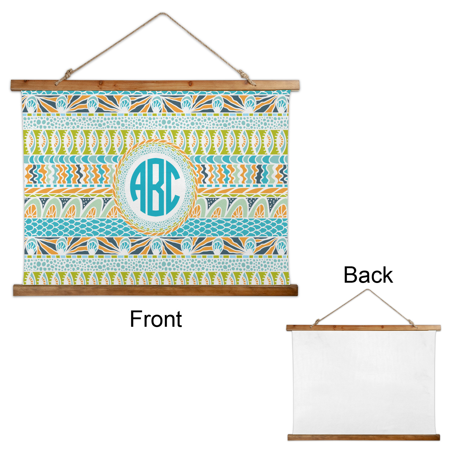 Made in two different orientations - portrait or landscape - both are 26" x 36". Your design is printed on a high quality polyester fabric with hemmed edges. The wood on the top and bottom of the tapestry is 1.25" tall and 0.25" thick and there are two pieces on top and bottom which sandwich the fabric.