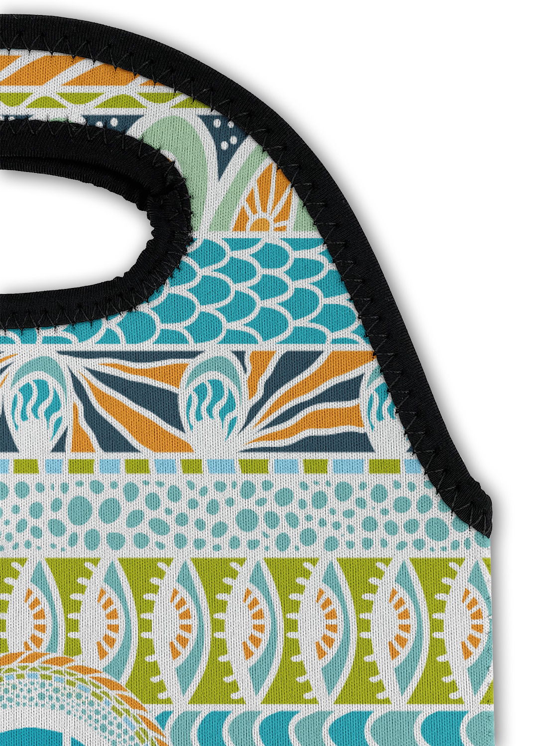 In the center of all the striped, rounded, and scaled mayhem is a white label, the eye of the storm, the perfect place for the personalization of your choice.