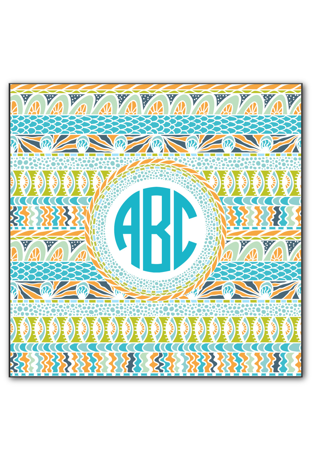 In the center of all the striped, rounded, and scaled mayhem is a white label, the eye of the storm, the perfect place for the personalization of your choice.