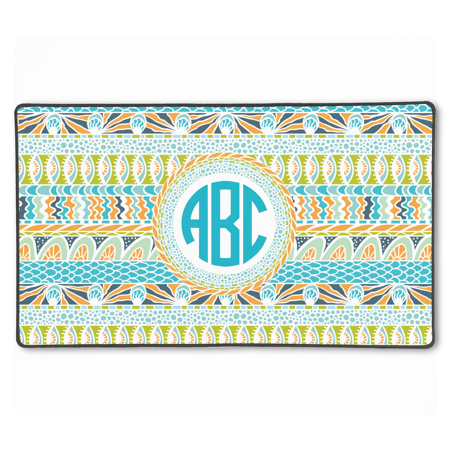 In the center of all the striped, rounded, and scaled mayhem is a white label, the eye of the storm, the perfect place for the personalization of your choice.
