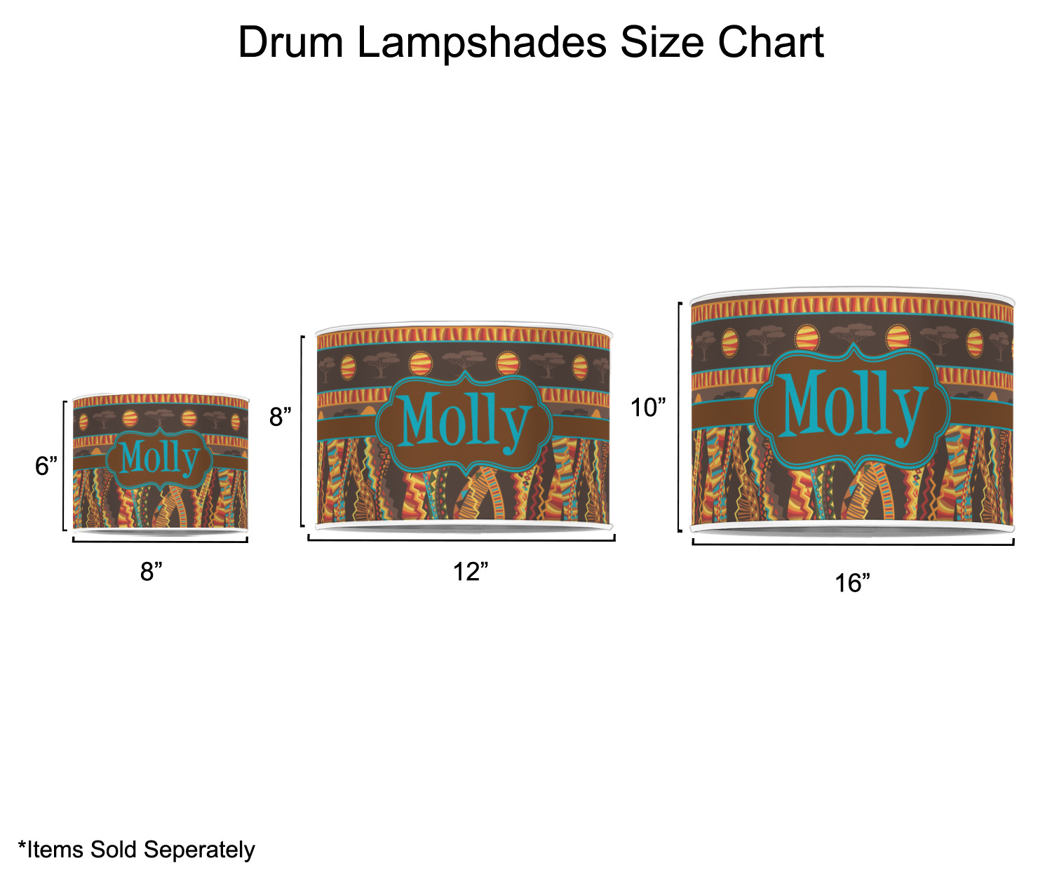 Our customized lamp shades also come in 3 different sizes: 8", 12" and 16", measuring at 8" in diameter by 6" tall, 12" in diameter by 8" tall, and 16" in diameter by 10" tall, respectively.