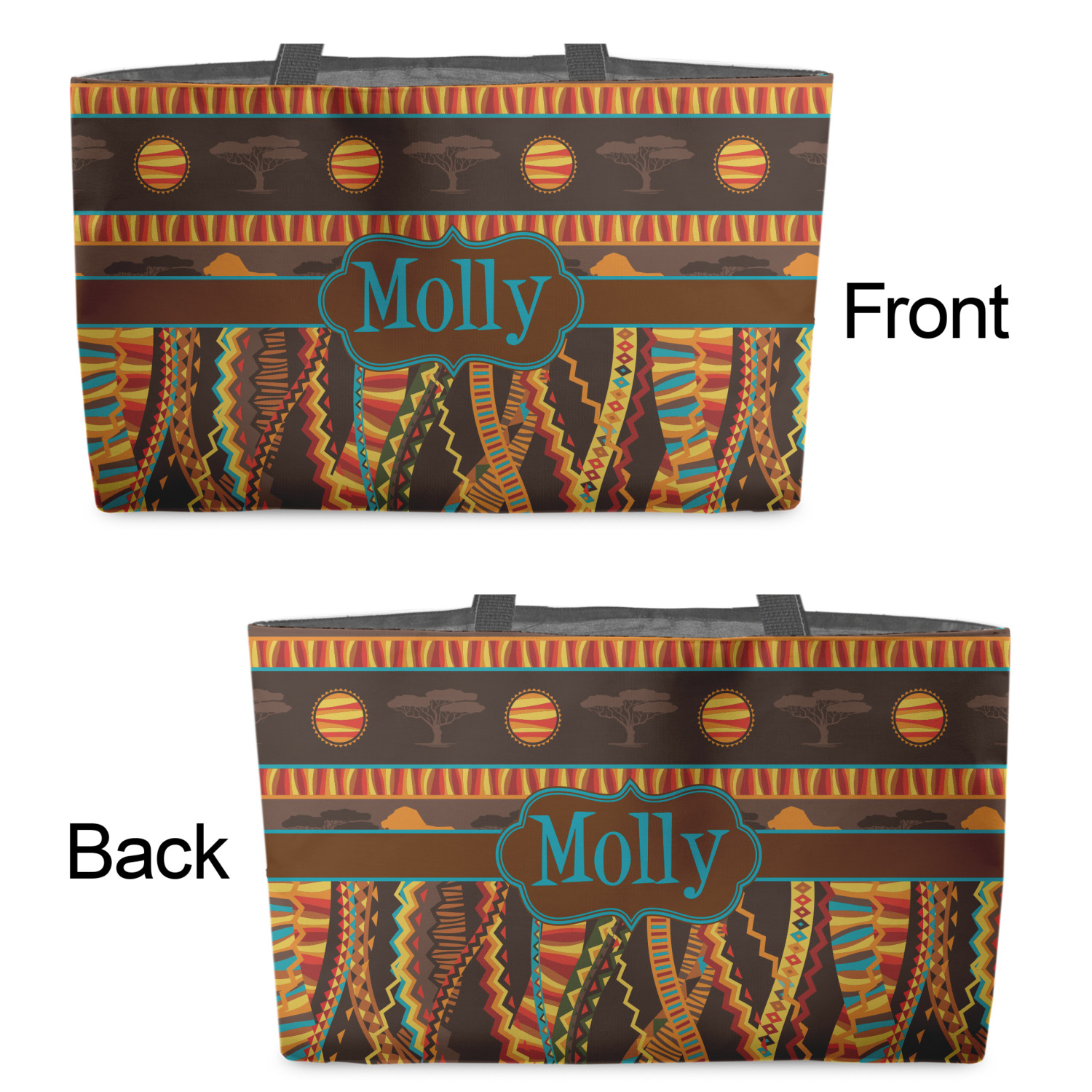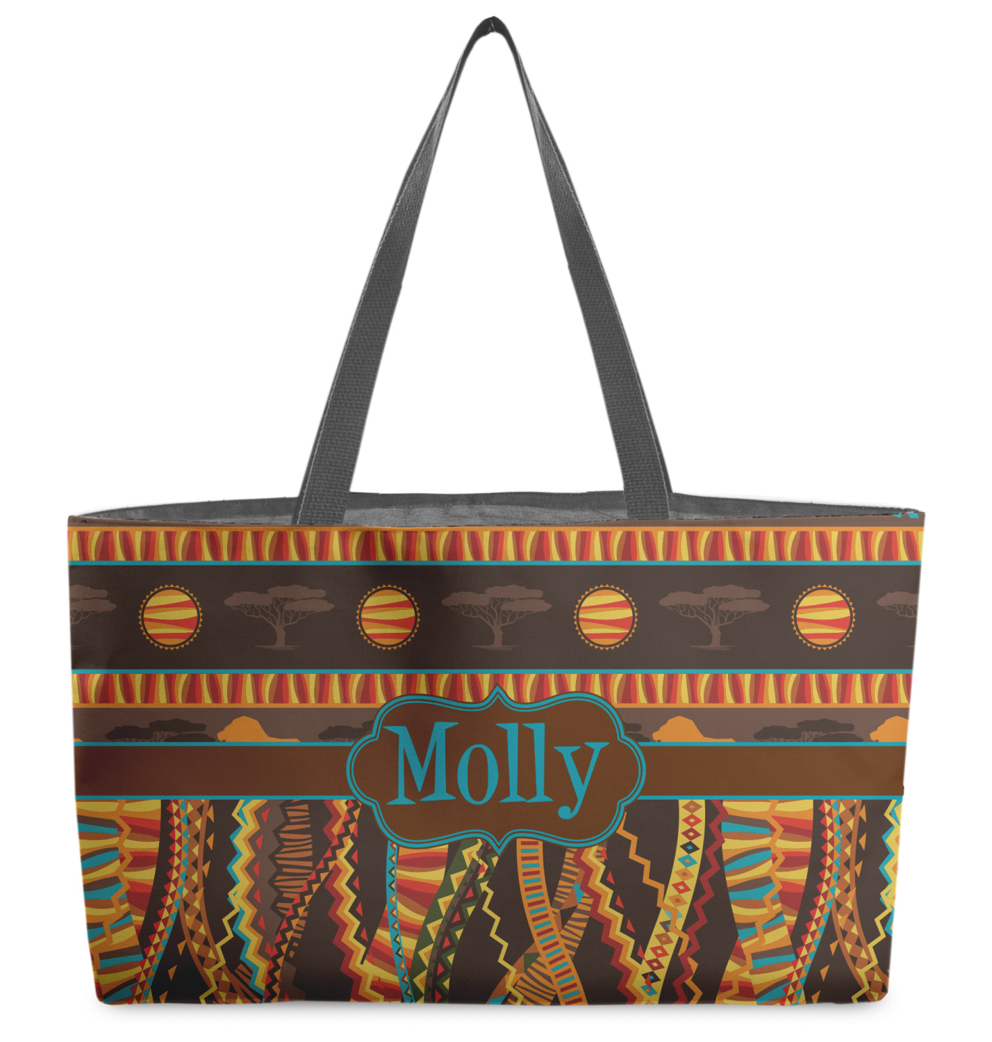 These beach totes are handmade here in the USA. Fabric is printed with your design. The tote is then sewn from the fabric pieces, lining and handles added.