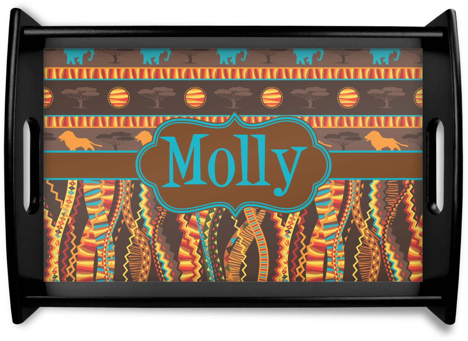 This serving tray with handles features square edges and two rounded sides, creating a very modern look. Each side is fabricated from a beautifully cut, natural wood. The bottom of the interior of the tray displays your customized design in bright, vibrant color. The tray is sold in both a black color and a natural wood look. Each variation of the wood serving tray has two sizes: Small, which is 14" x 10" x 2.25", and Large, which is 19.5" x 13.5" x 2.75".