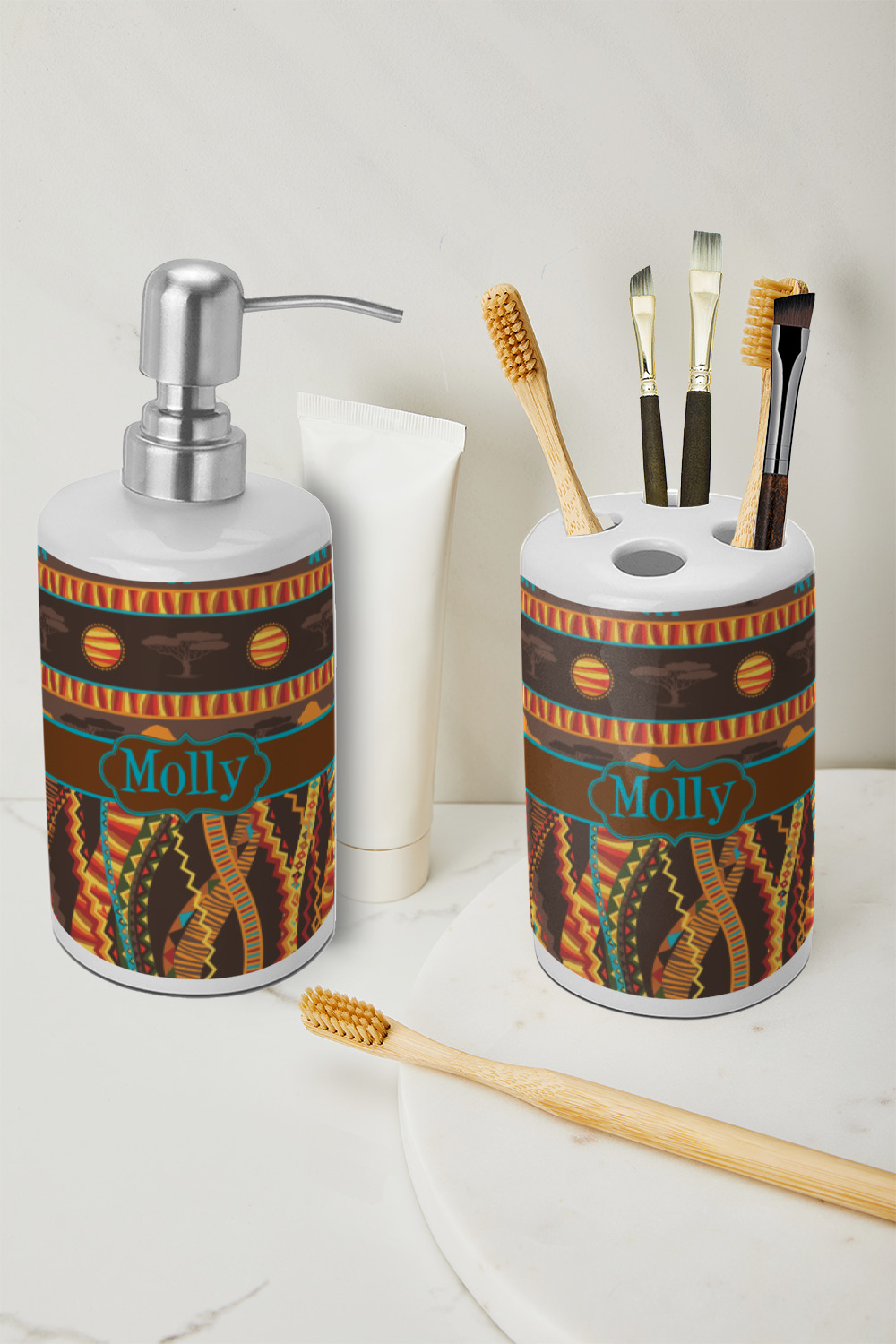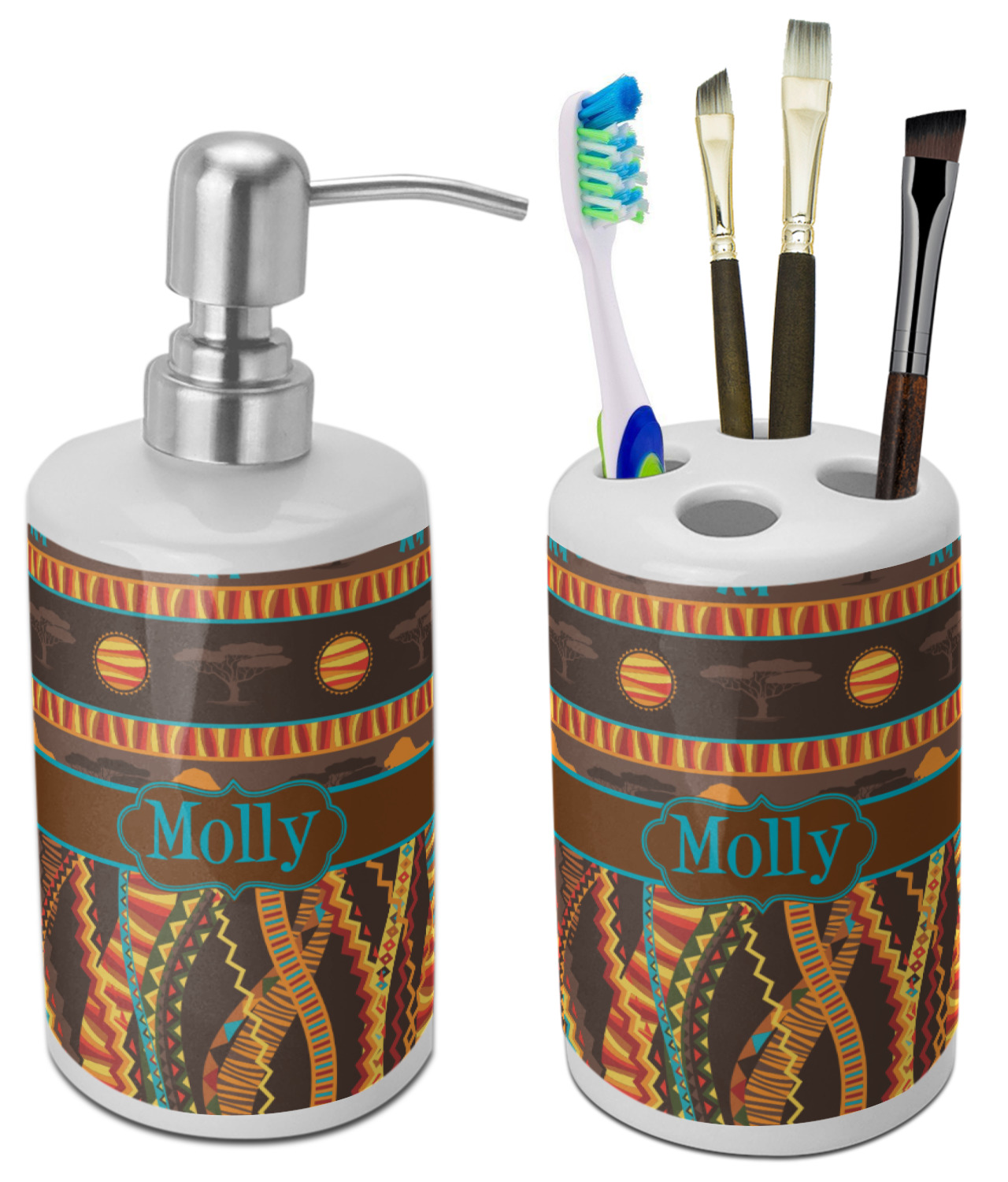 This two piece, ceramic bathroom set will add the perfect splash of color to any bathroom. This set includes one pump dispenser, ideal for soap or lotion, and one toothbrush holder with four holes. Although originally designed for toothbrushes, the holder will also hold make-up brushes, nail files, and other bathroom tools.