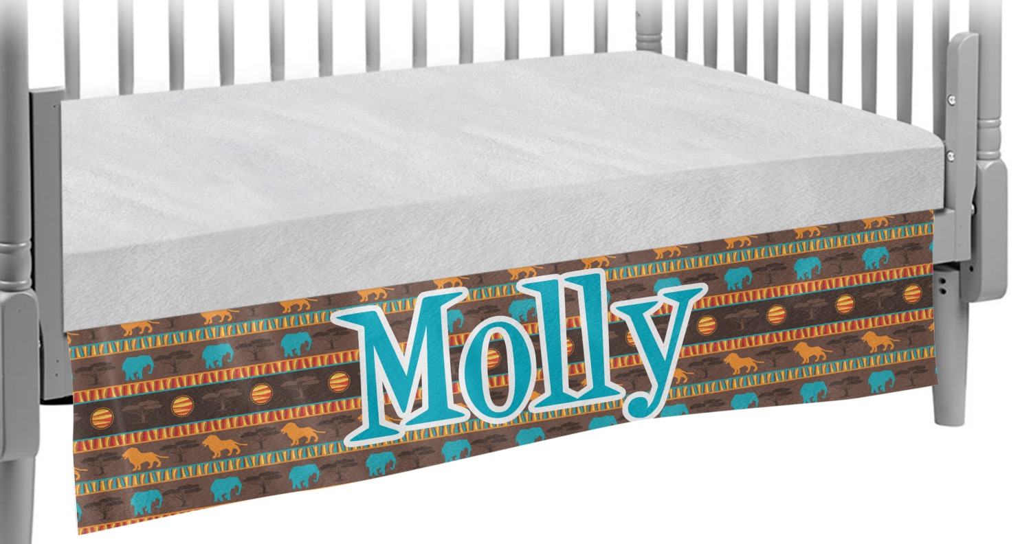 This baby crib skirt is made from two different materials and has split corners for easy placement and removal. The four corners are made from a soft, minky-like material, while the center is made of microfleece. The dual fabric makes this product durable, and still soft-to-the-touch. We provide you with the option of designing each of the four sides to be entirely unique, or to match one another, depending on your creative vision. Your personalization is displayed across the outside of the custom crib skirt, in vibrant colors. When inserted, each side panel drops 15" and is designed to touch the floor at its lowest setting.