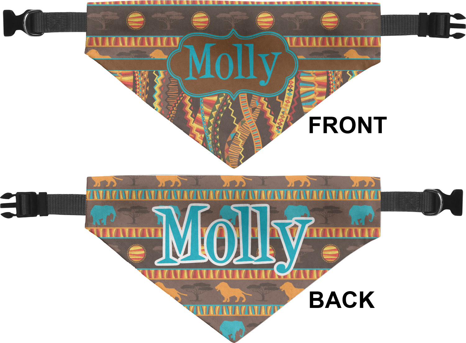 We print the front and back of these dog bandanas with your customized design. The bandana itself is made from a durable polyester, sewn together with a gap large enough to accommodate any collar. Regardless, the bandana includes a plain black, canvas collar with plastic snaps, that can easily be removed if desired. These dog bandana collars are available in four sizes: small, medium, large, and extra large. Please see our sizing chart for more information regarding the dimensions of each size.