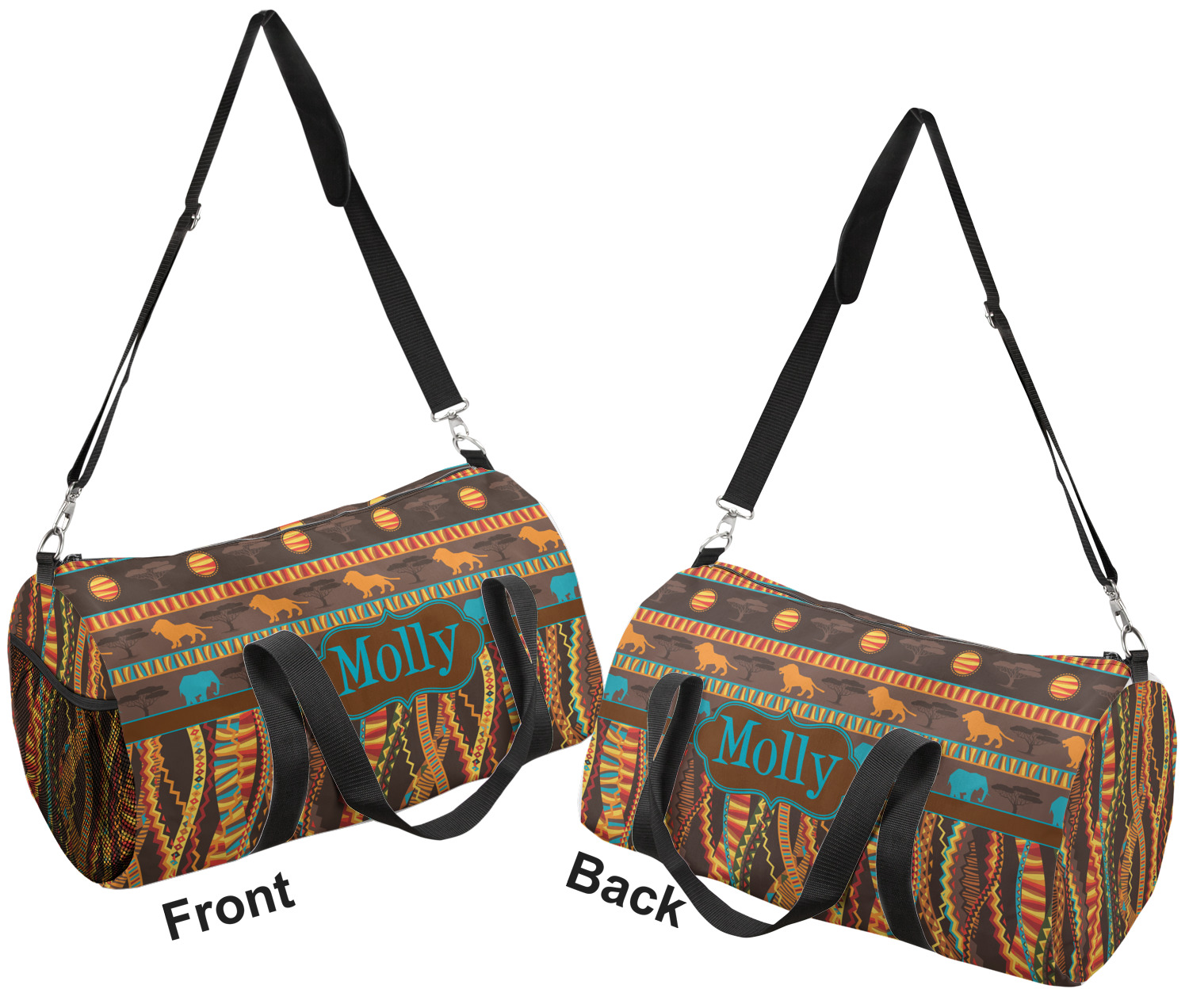 This duffle is a sturdy bag made of a canvas material. It comes in two sizes: Small (19"W x 9.5"H x 9.5"D) and Large (23"W x 12"H x 12"D). The bag is a cylindrical shape with a black adjustable strap and two handles. On one side is an elastic pouch to put a waterbottle or other small item. Your product will be sublimated with your design and is able to be designed on the front, back, and sides. Be sure to remember that the straps may cut into parts of your design if you upload your own artwork.
