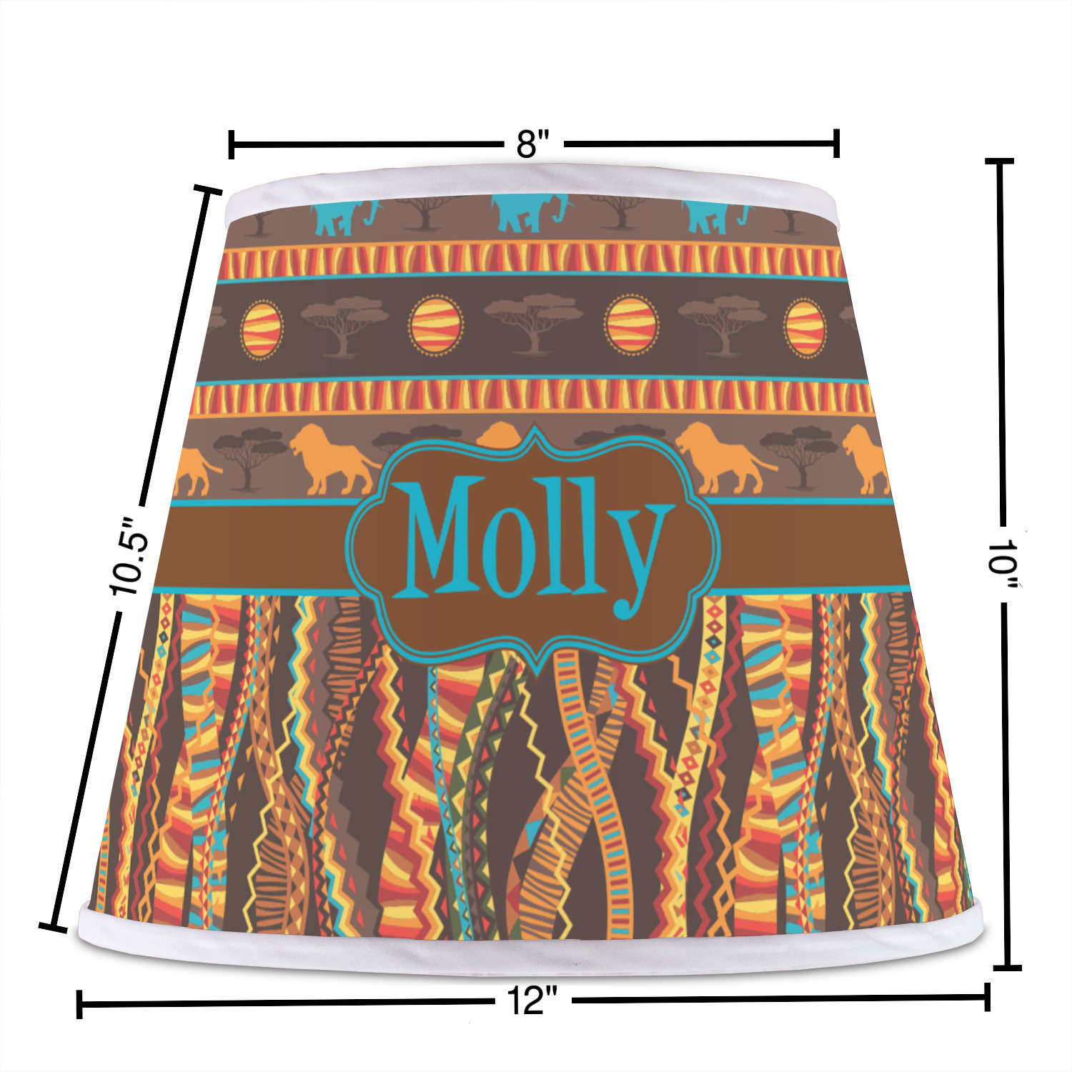 The base of this lampshade is 12 inches in diameter, and the top spans 8 inches in diameter. The total height of the lampshade is 10 inches. The angled nature of this custom lampshade concentrates the light, making it ideal for smaller spaces. This lampshade is made of matte, polyfilm, and displays your customization in its middle. The top and bottom of this colorful lamp shade are lined with a white fabric ribbon (which can be replaced with black inside the design studio) which frames your design and creates a sophisticated finish. As an UNO fitter lampshade, this unique lamp shade will fit a variety of bases.