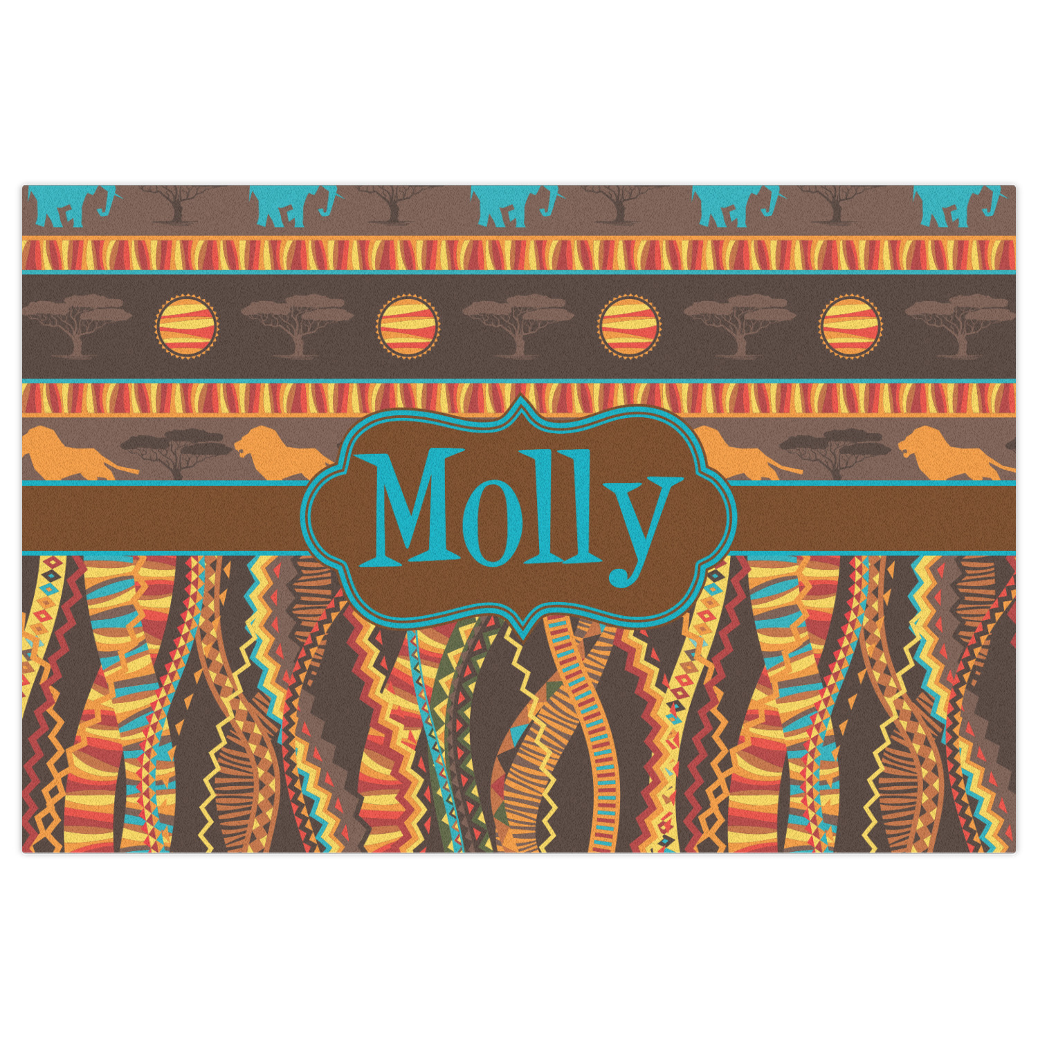 Traditional meets trendy in this fun, tribal design. The African Lions & Elephants design depicts the kings of the African Safari in gorgeous warm colors and teal highlights.