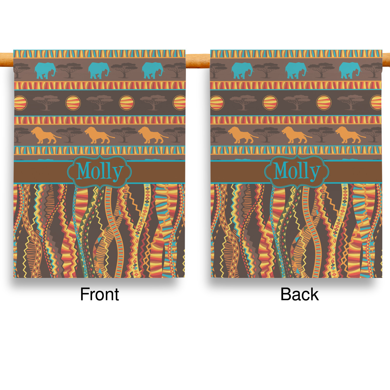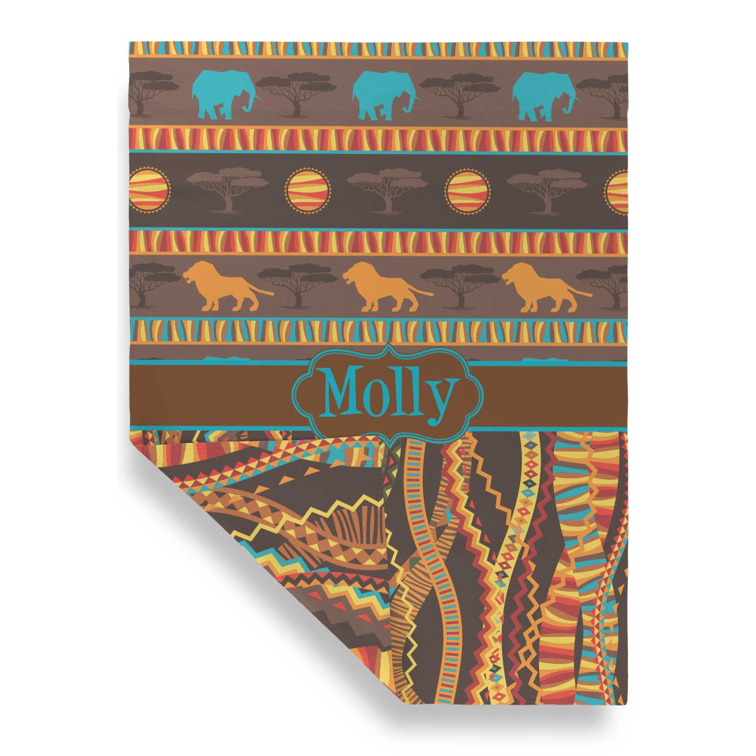 Traditional meets trendy in this fun, tribal design. The African Lions & Elephants design depicts the kings of the African Safari in gorgeous warm colors and teal highlights.