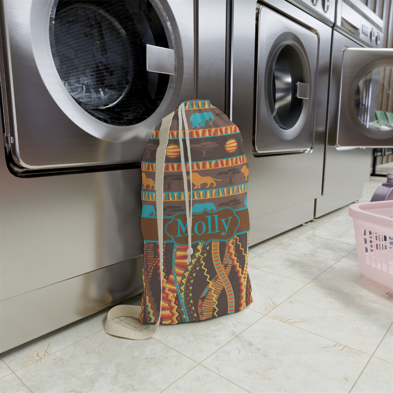 Carry your laundry in style with these customized laundry bags. Available in two sizes, featuring a natural colored woven strap and a cinch cord, these bags hold a lot of clothes or anything else you want to fit in them.