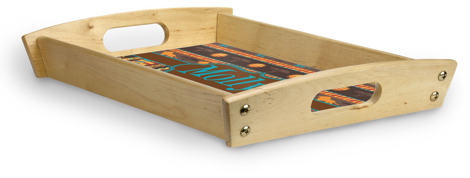 This serving tray with handles features square edges and two rounded sides, creating a very modern look. Each side is fabricated from a beautifully cut, natural wood. The bottom of the interior of the tray displays your customized design in bright, vibrant color. The tray is sold in both a black color and a natural wood look. Each variation of the wood serving tray has two sizes: Small, which is 14" x 10" x 2.25", and Large, which is 19.5" x 13.5" x 2.75".