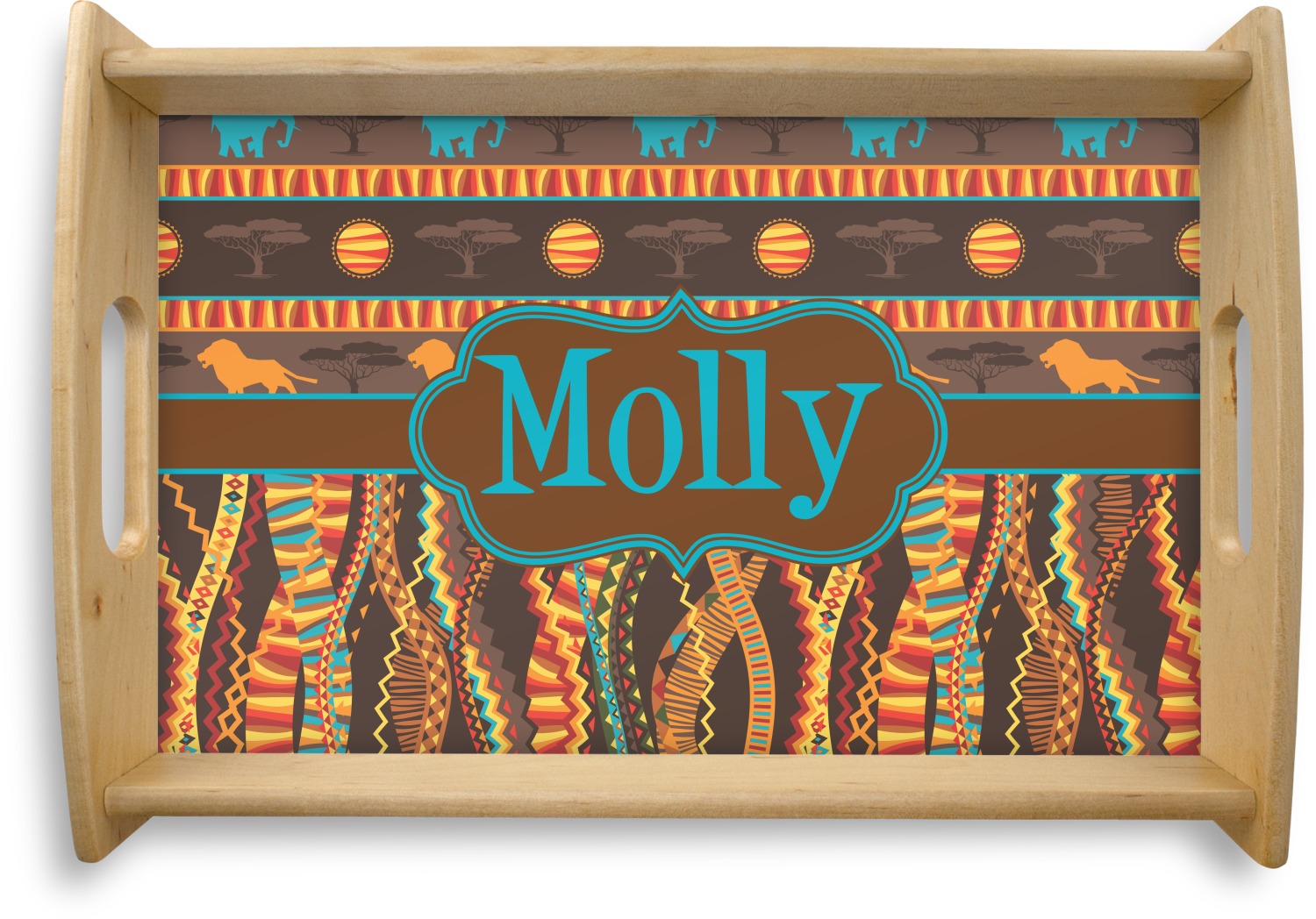 Traditional meets trendy in this fun, tribal design. The African Lions & Elephants design depicts the kings of the African Safari in gorgeous warm colors and teal highlights.