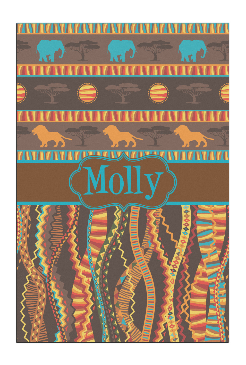 Traditional meets trendy in this fun, tribal design. The African Lions & Elephants design depicts the kings of the African Safari in gorgeous warm colors and teal highlights.
