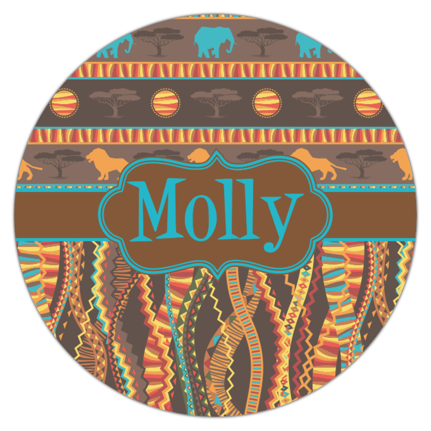 Traditional meets trendy in this fun, tribal design. The African Lions & Elephants design depicts the kings of the African Safari in gorgeous warm colors and teal highlights.