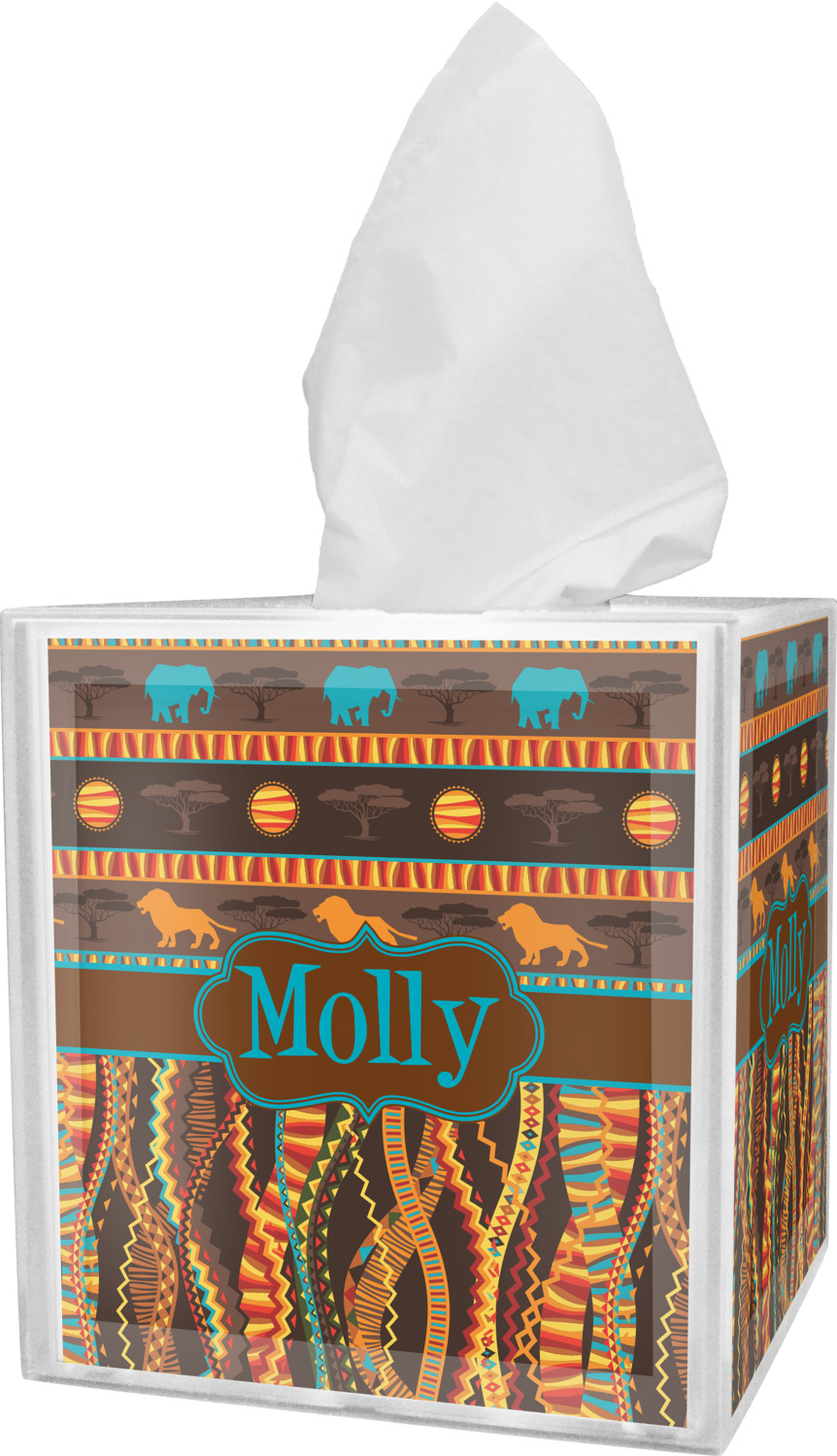 These tissue holders are built from durable acrylic and display your unique personalization on fine-quality vinyl inserts placed within the four sides and top. The box features two pieces, allowing you to easily switch out tissue boxes. On the sides, youll find ridges that ensure the top and base fit securely in place. The bottom of these tissue box holders has four, rubber, non-slip pads to prevent the box from scuffing any surface you decide to display it on. Each box can fit a standard 5 by 5-inch box of tissues.