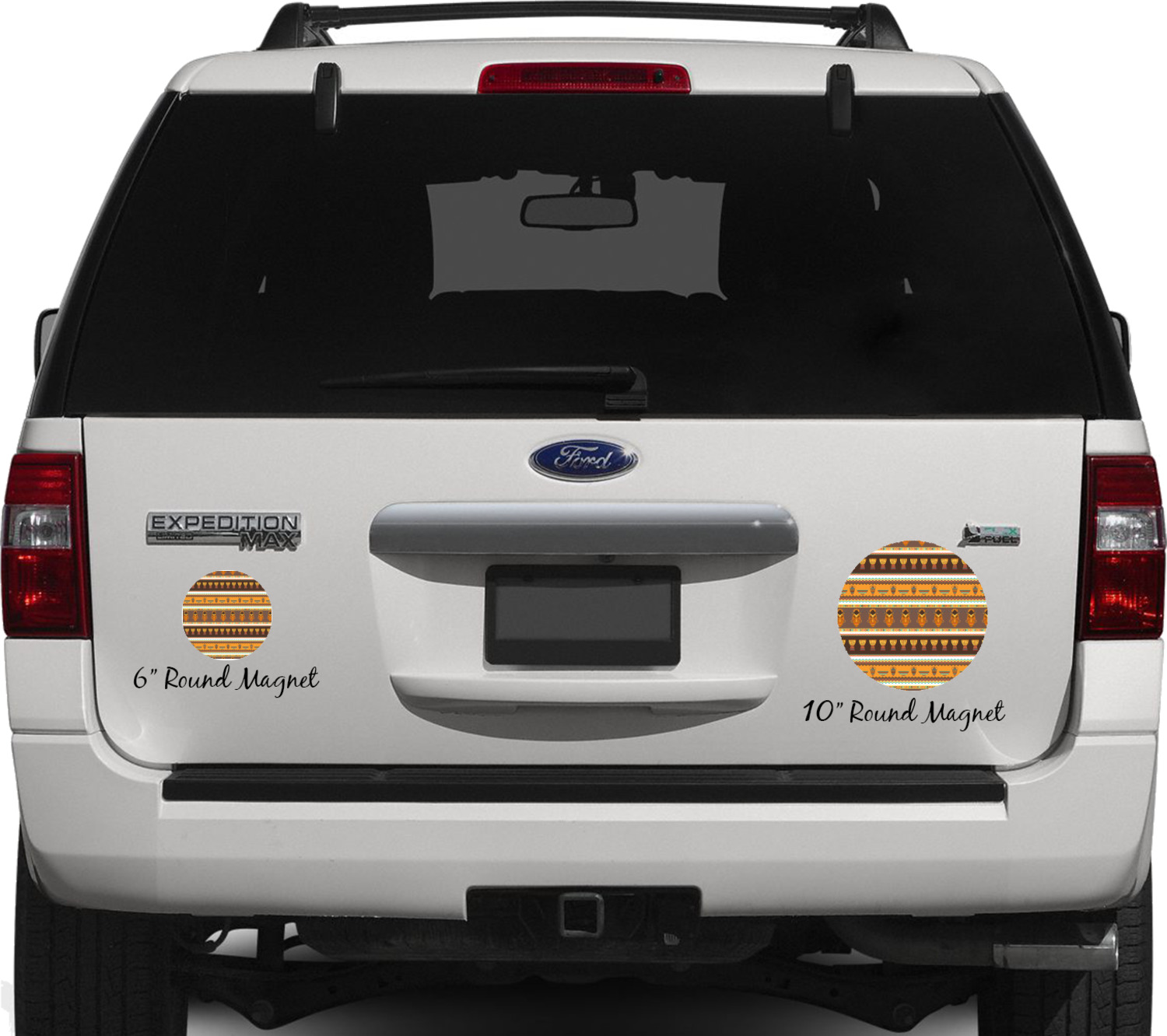 Your personalized car magnets are available for purchase in two shapes and two sizes. We carry round and square editions; each shape can either be 6 by 6 inches, or 10 by 10 inches, depending on your needs. Both versions are 1 millimeter thick, which is considered, within the industry, as the ideal thickness for automobile magnets. The magnetic car decals will adhere to any smooth, metal surface of your cars body, such as the trunk door or a side panel. However, please note that some vehicles are constructed from fiberglass bodies, which prevents the adhesion of anything magnetic. We advise that you test your vehicle before purchasing these magnets.