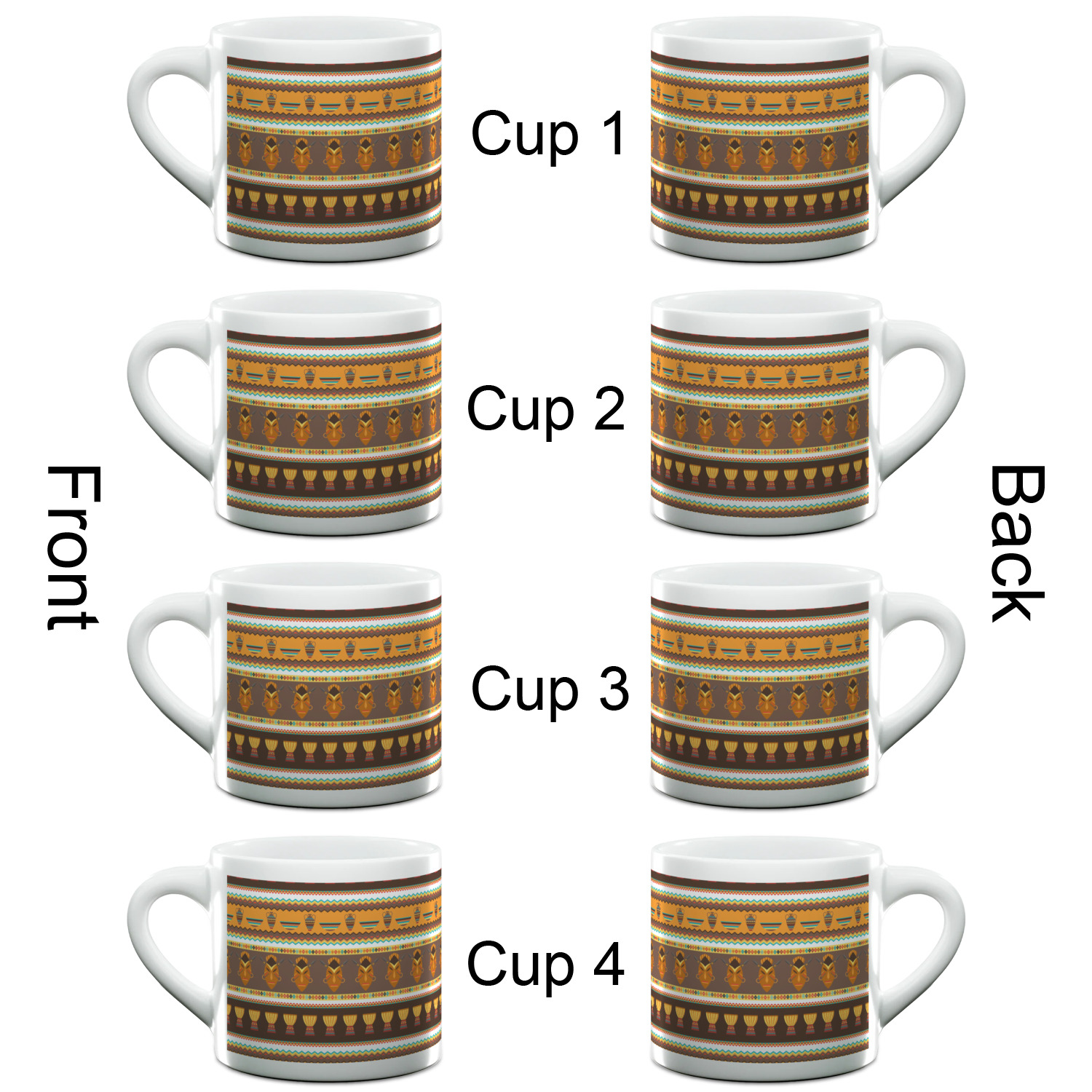 Each of our espresso mugs is a ceramic material sure to keep your drink warm. Personalize one cup for yourself, or order a set of 4! Its the perfect little gift for any coffee lover! We carry two sizes for you to personalize - 3 oz. (approx. 3.25" x 2.325" x 2.625") or 6 oz. (approx. 4" x 2.9" x 2.9"). Our 3 oz. mug is perfect for that single shot espresso while our 6 oz. mug can be your next favorite cappuccino cup holding two shots of espresso!
