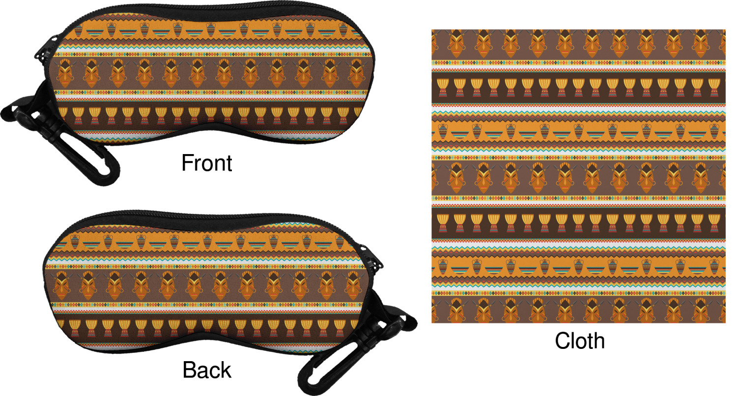 The cases have the design on both sides, a black zipper, and clips for hanging on a belt buckle or purse strap and also include matching lens cloths.