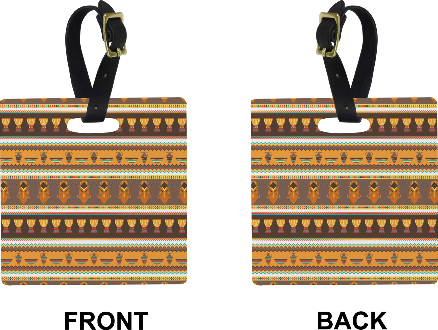 These personalized bag tags are sold in a variety of shapes, so that you may find the product that meets your vision exactly. We sell a round luggage tag, which measures at approximately 4" x 4". Our square luggage tag is about 3.5" x 3.5", while our rectangular version is 2.75" x 4 ".