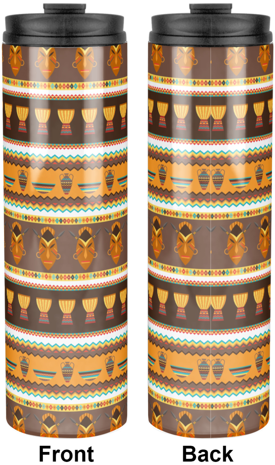Traditional meets trendy in this fun, tribal design. This African Masks design depicts traditional tribal masks, vases, and bowls all in gorgeous warm colors.