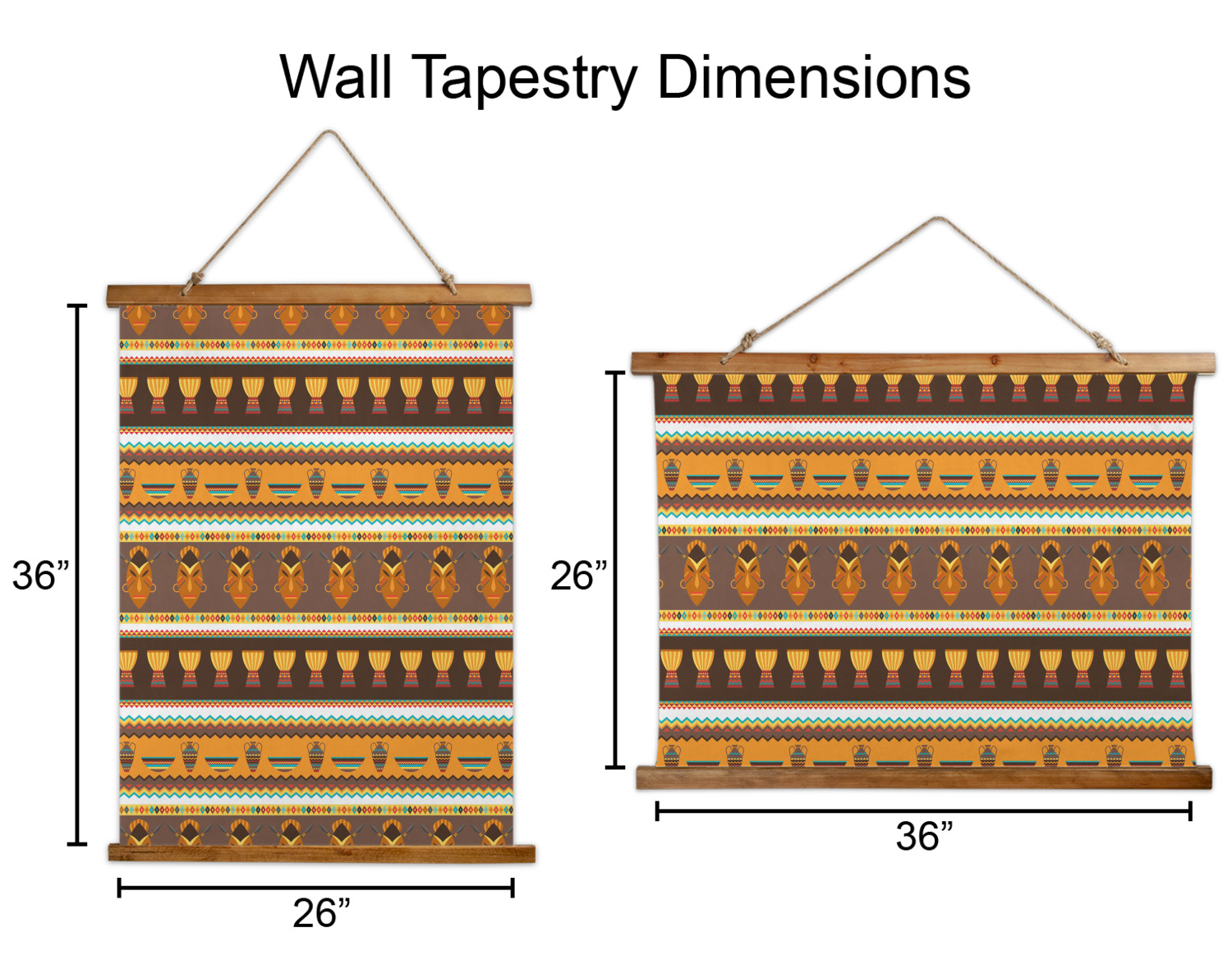 Made in two different orientations - portrait or landscape - both are 26" x 36". Your design is printed on a high quality polyester fabric with hemmed edges. The wood on the top and bottom of the tapestry is 1.25" tall and 0.25" thick and there are two pieces on top and bottom which sandwich the fabric.