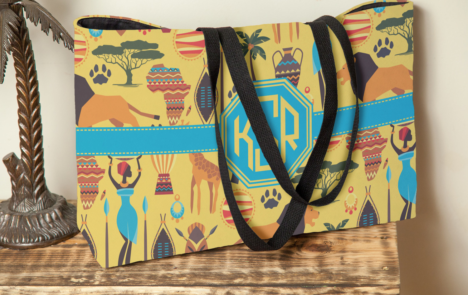 When you think of Africa, multiple things come to mind. Lions. Elephants. Giraffes. Intricate vases. This design encompasses everything you could imagine about the African Safari, all overlaid on a bright yellow background.