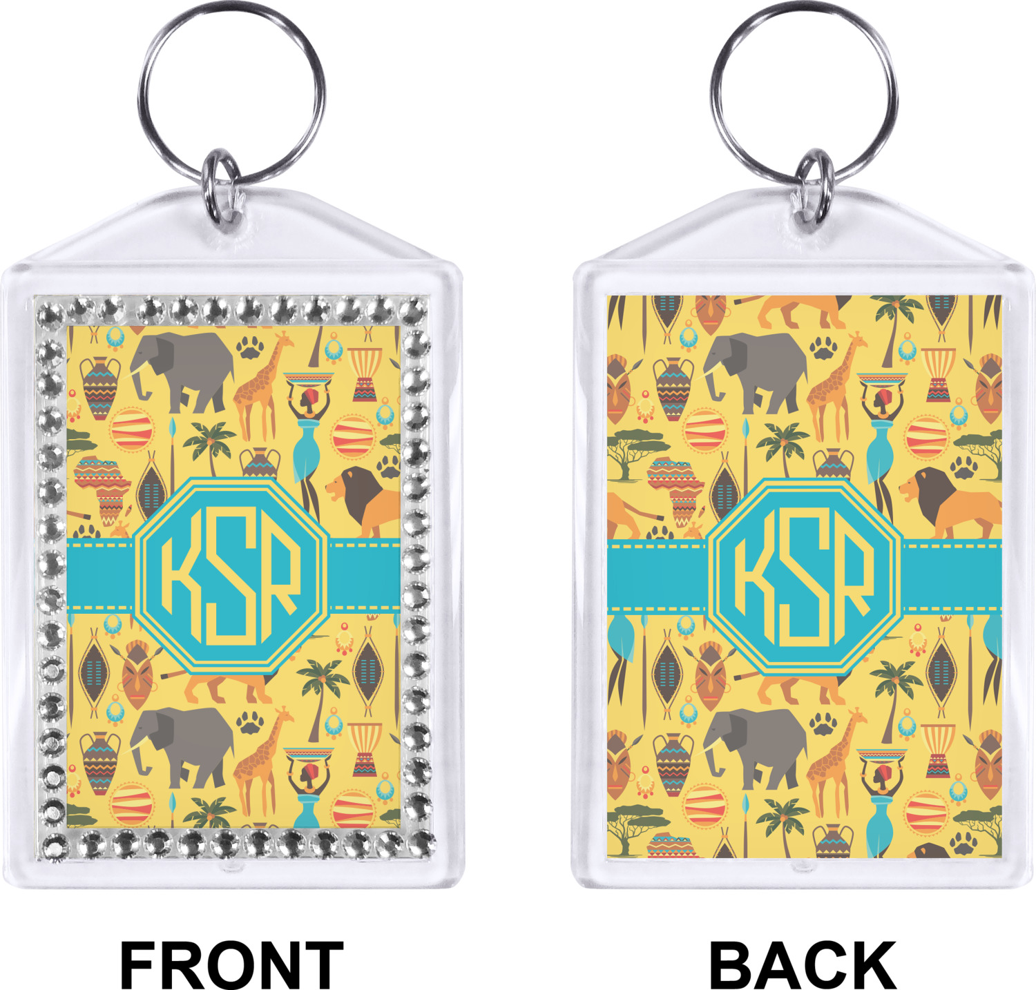 Our personalized keychains have a bold, rectangular shape, outlined by a series of shimmering rhinestones. A metal, split keyring is included with your purchase, and an additional metal hoop allows for attachment of the keychain to the split ring. This unique keychain measures at about 3.75 by 2.5 inches. We print your customized design(s) across both the back and front of this keychain.