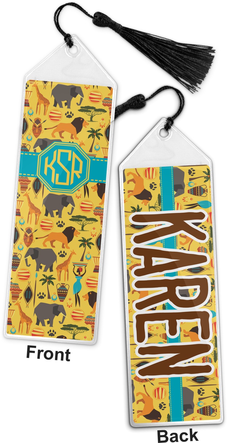 Your personalized bookmark is made of a sturdy, clear vinyl, and is approximately 7.5" x 2.25". We display your personalization on vinyl inserts that are placed on both sides. Accompanying each book marker is a black, fringe tassel that attaches to the reinforced, triangular header.