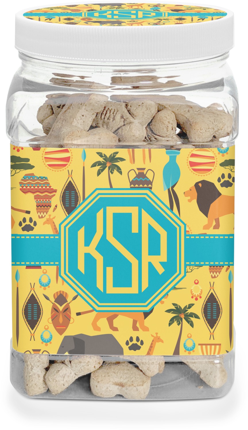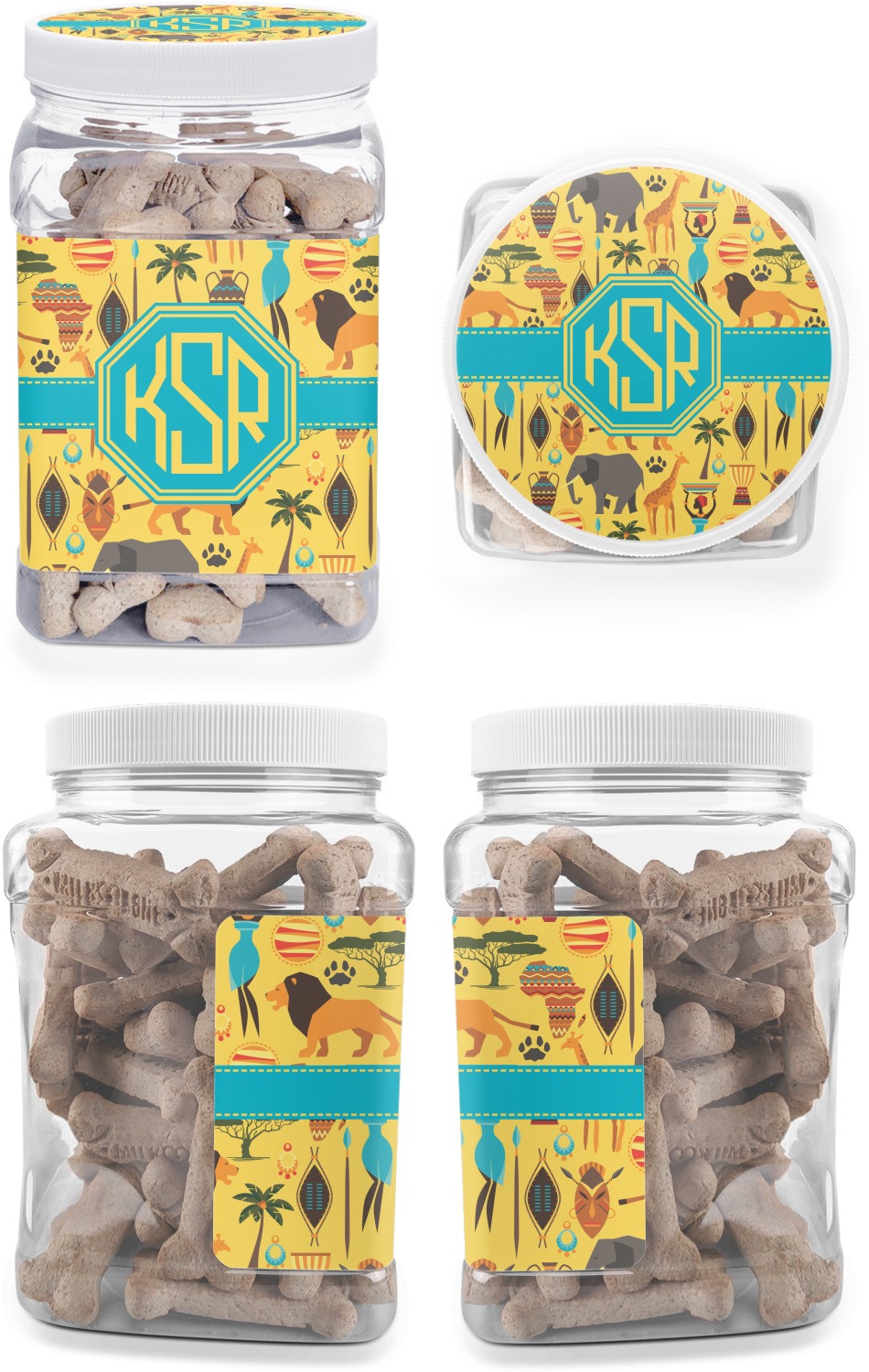 This half gallon jar, made from a sturdy plastic, is the perfect way to keep treats from any naughty pet paws, while still keeping them ready on hand for when your pup performs an impressive trick. This dog cookie jar features a screw-on, white lid that displays your personalized design on a vinyl sticker. We apply another customized sticker that wraps around the front and sides of the jar. Our dog treat jar also has indentations on the rear ends of the sides, which allows for convenient handling, and its square frame allows for easy storage.
