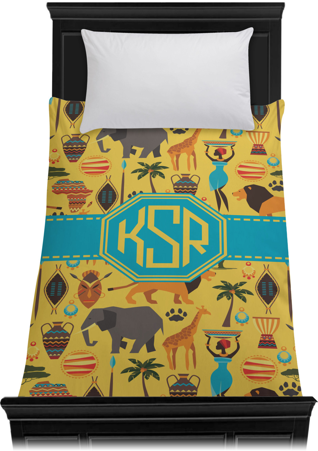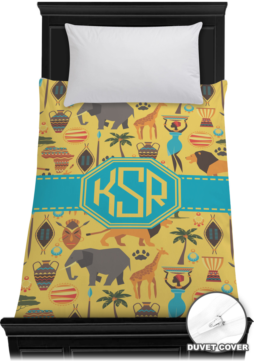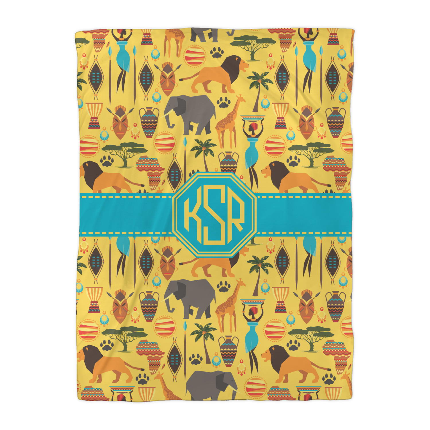 When you think of Africa, multiple things come to mind. Lions. Elephants. Giraffes. Intricate vases. This design encompasses everything you could imagine about the African Safari, all overlaid on a bright yellow background.